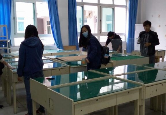 11月16日,天下着细雨蒙蒙,我院“艺家人”青年志愿者协会在南校美术楼3楼开展“整洁课桌,和谐校园”的课桌文化活动。 上午9点,所有的志愿者们准时到场并进行了简单的分组,分好后的三个小组分别去清洁不同的教室课桌。到达教室后,志愿者们拿出早已准备好的抹布、香蕉水和手套开始清洁课桌。活动过程中志愿者们默契十足,有的人是专门往课桌上涂香蕉水的,有的人是专门擦洗的,一切显得井然有序。尽管刺鼻的香蕉水味充斥在教室的各个角落,但是志愿者们仍然卖力的干着手头工作。尽管水池的水很冷,但是志愿者们仍然换洗着变脏的抹布,大家都在享受着志愿服务的乐趣。教室外寒风细雨,教室内却一片温馨。在志愿者们的携诚合作,课桌文化活动圆满结束。 课桌文化不仅毁坏了课桌的整洁性,还影响学生的学习积极性。这次“整洁课桌,和谐校园”课桌文化活动,不仅清洁了课桌,让学生有更好的学习环境,而且通过志愿者活动宣传了文明校园、和谐校园的理念。