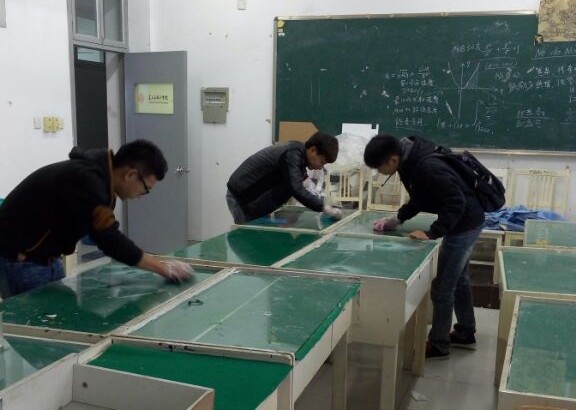 上午9点,所有的志愿者们准时到场并进行了简单的分组,分好后的三个小组分别去清洁不同的教室课桌。到达教室后,志愿者们拿出早已准备好的抹布、香蕉水和手套开始清洁课桌。活动过程中志愿者们默契十足,有的人是专门往课桌上涂香蕉水的,有的人是专门擦洗的,一切显得井然有序。尽管刺鼻的香蕉水味充斥在教室的各个角落,但是志愿者们仍然卖力的干着手头工作。尽管水池的水很冷,但是志愿者们仍然换洗着变脏的抹布,大家都在享受着志愿服务的乐趣。教室外寒风细雨,教室内却一片温馨。在志愿者们的携诚合作,课桌文化活动圆满结束。