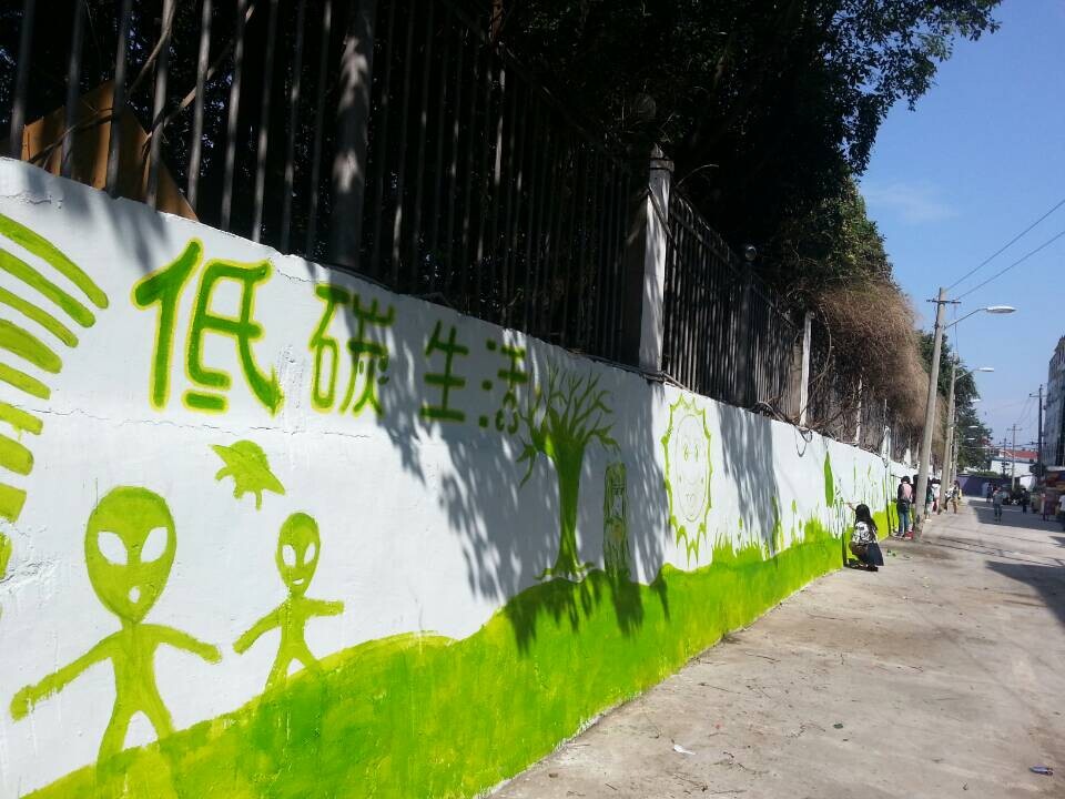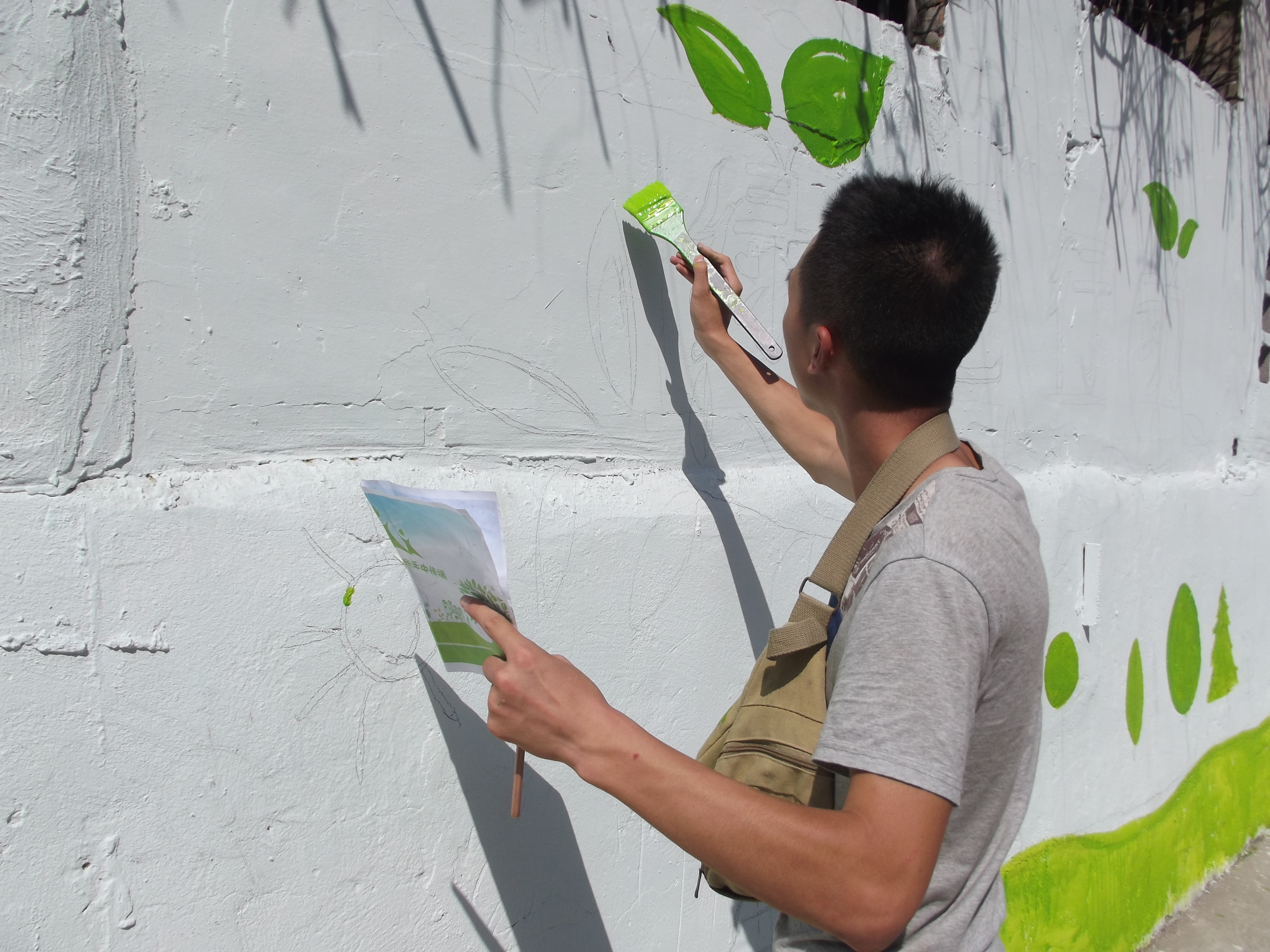 一支支画笔,一面面白墙,一群怀揣着“爱心融入创作,艺术奉献社会”信念的大学生志愿者,将瓯海区茶山镇梅泉大街小吃巷的墙面装扮一新,曾经脏乱的街道如今变成了一道靓丽的城市文明风景线。 10月12日上午8点,万象城awc888“艺家人”青年志愿者协会与瓯海区茶山镇梅泉社区居委会合作举办了“创建文明城市”的墙绘活动。激情满怀的大学生志愿者们结合自身专业优势,以“创建文明城市”为主题,以绿色作为主色调,宣传低碳环保的生活理念。在志愿者的认真绘制下,白色空旷的墙壁被一幅幅美丽的图画所代替,引来附近居民一片赞叹。