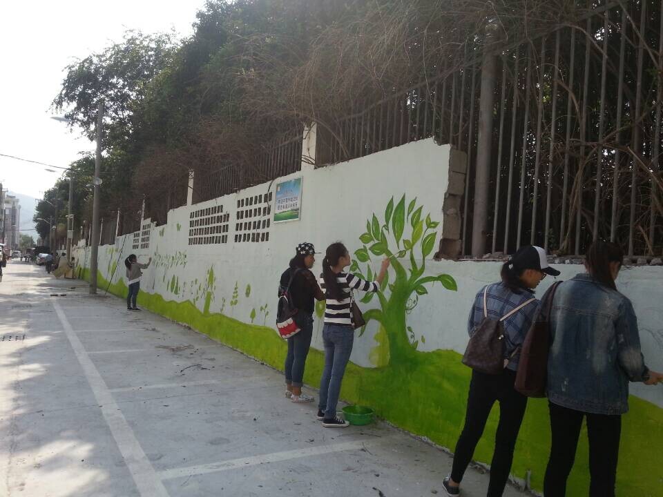 10月12日上午8点,万象城awc888“艺家人”青年志愿者协会与瓯海区茶山镇梅泉社区居委会合作举办了“创建文明城市”的墙绘活动。激情满怀的大学生志愿者们结合自身专业优势,以“创建文明城市”为主题,以绿色作为主色调,宣传低碳环保的生活理念。在志愿者的认真绘制下,白色空旷的墙壁被一幅幅美丽的图画所代替,引来附近居民一片赞叹。