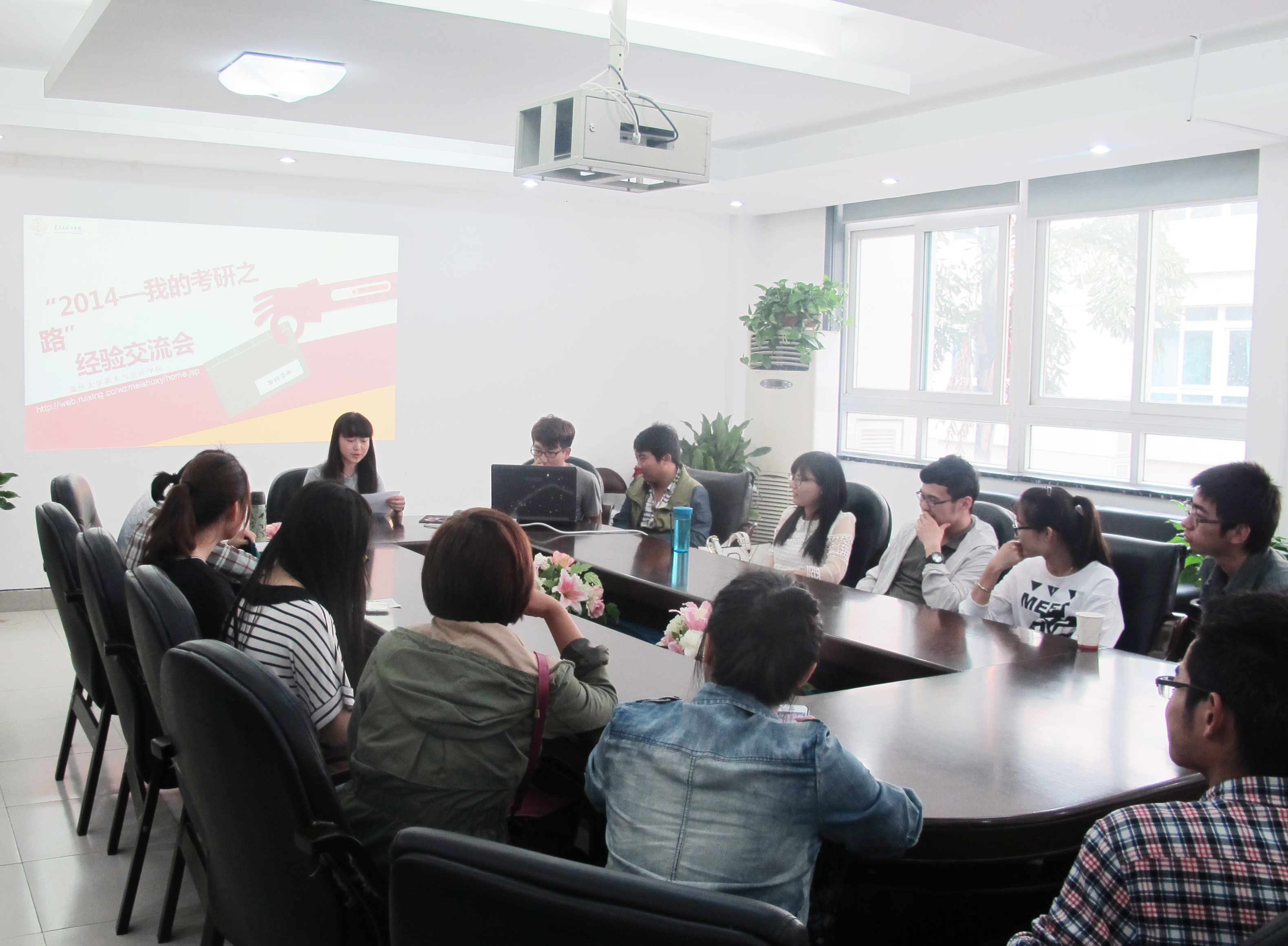 5月14日下午,由万象城团委学生会学术科技部主办的“2014梦想的延续——我的考研之路经验交流会””在2B-216顺利举行。学生科副科长叶如芳、辅导员杜茜老师和10级考研录取的同学出席了此次活动。