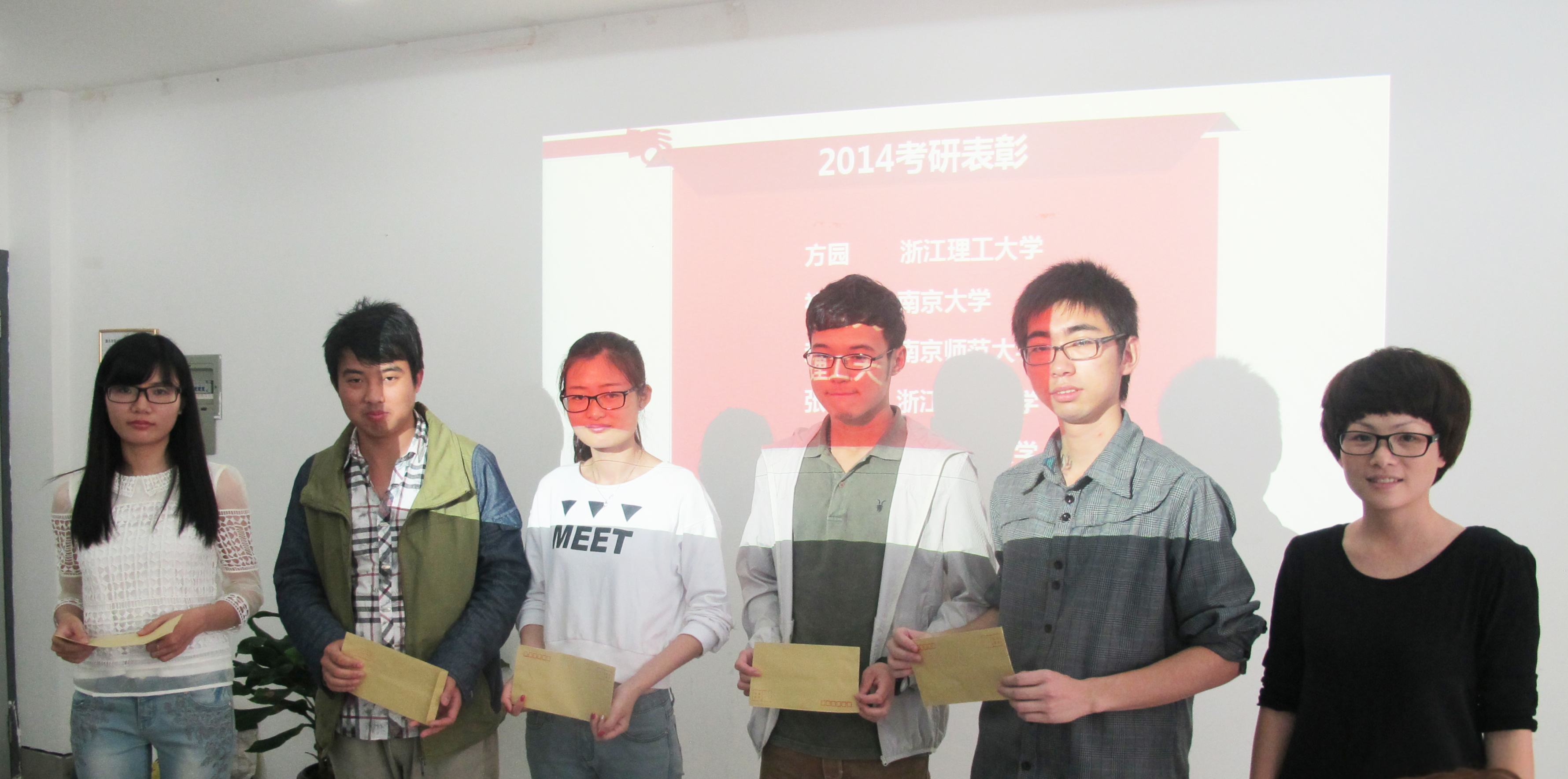叶老师首先对万象城2014年国内考研成功录取的美本师范班褚明敏、服装设计与工程班方圆、环境艺术设计班赵锦程、美本班张伟佳、服装设计班邬仁亚,和国外考研成功录取的环境艺术设计班袁炜楠、平面设计班李奕璠、鞋靴设计班魏子八位同学进行了表彰仪式,并颁发了学院奖金。叶老师讲到,考研经验交流会让在座的每位同学能够真切、直观、详实地体会考研路上的辛苦与喜悦,相信在知识道路上坚持的同学们都会收获更好的自己!