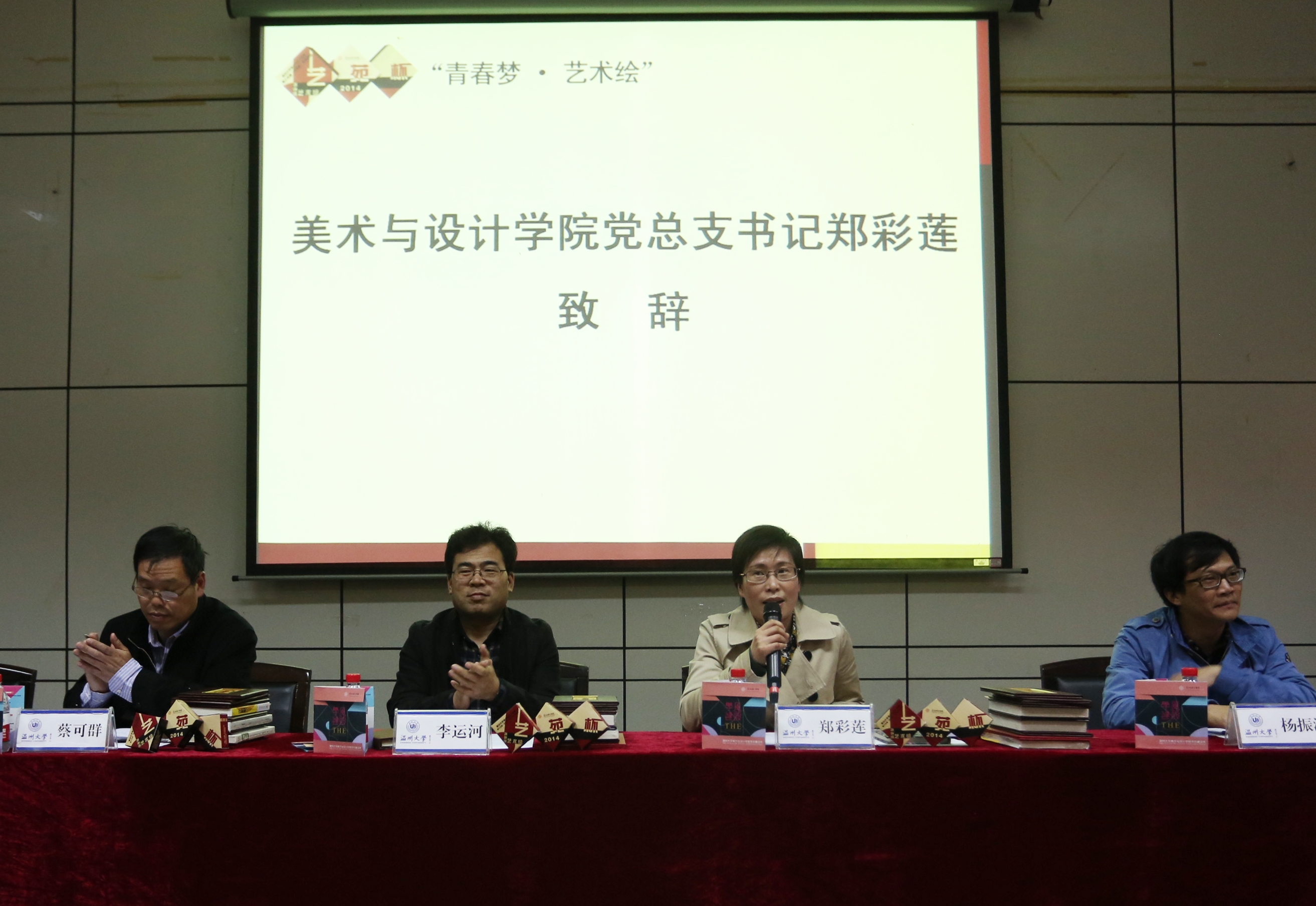 在致辞中,郑彩莲书记感叹于同学们的才华和创意,对仪式现场的宣传册、邀请函、礼品赞叹不已,对活动能够结合专业、激发创意表示赞赏和欣慰。然后,她用林徽因的诗句“是爱、是暖、是希望”生动展现了“艺苑杯”所营造的“四月天”般的艺术气息。她回顾了“艺苑杯”十四年励志奋进、创新进取的历程,肯定了十四年来“艺苑杯”为促进艺术展示和创作交流、提升学生才华技艺和实践能力、营造艺术氛围和学习环境,推动人才培养和学院发展所做出的贡献。接着,她赞扬了美院学子在过去一年里为响应“中国梦”号召所开展的诸多活动及所获收益,并指出今年的“艺苑杯”将继续发扬“中国梦”的指导思想,以“青春梦·艺术绘”为主题,号召学子们用青春和梦想点燃创作的激情和灵感,用精湛的作品和优秀的成果描绘瑰丽夺目的青春梦想。最后,她希望同学们有“敢于有梦、勇于追梦、勤于圆梦”的意志品格,去参与“艺苑杯”,去实现“青春梦”。