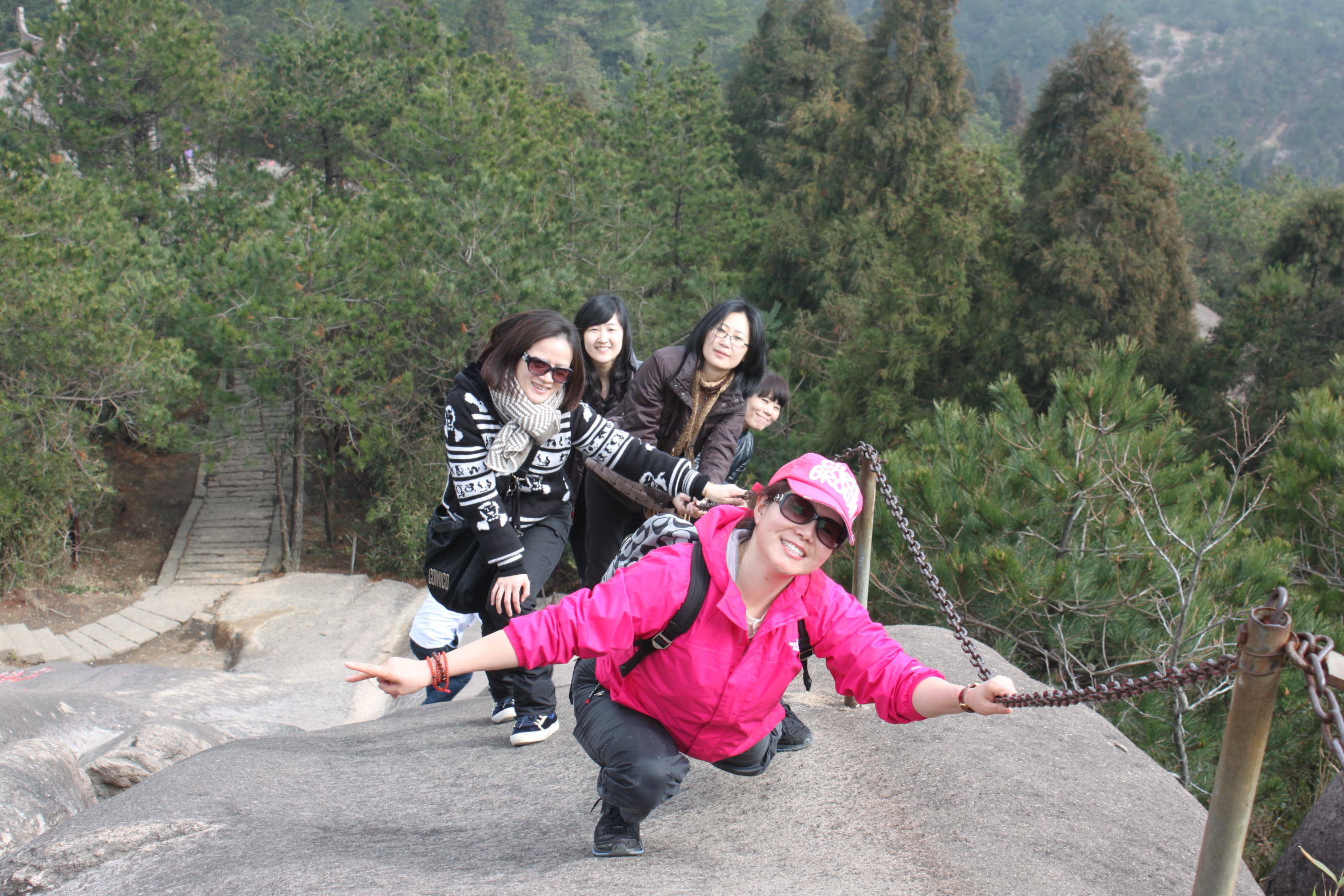 行至玉苍山脚下,女同胞们开始摩拳擦掌。玉苍山景区融文景观与山、石、溪、瀑、湖、林、寺为一体,雄浑幽秀,兼而有之。主峰大玉苍海拔921.5米,林木丰茂,奇石荟萃。这里无处不石,无石不美,各具神态,妙趣天成。向着顶峰攀登,女汉子们个个健步如飞。行至中途,有的放缓脚步,边走边欣赏山间风景。一路之上,相互激励,互相扶持,为达到顶峰成为真正的英雄好汉而欢呼雀跃,纷纷眺望美景,留下英姿飒爽的倩影。