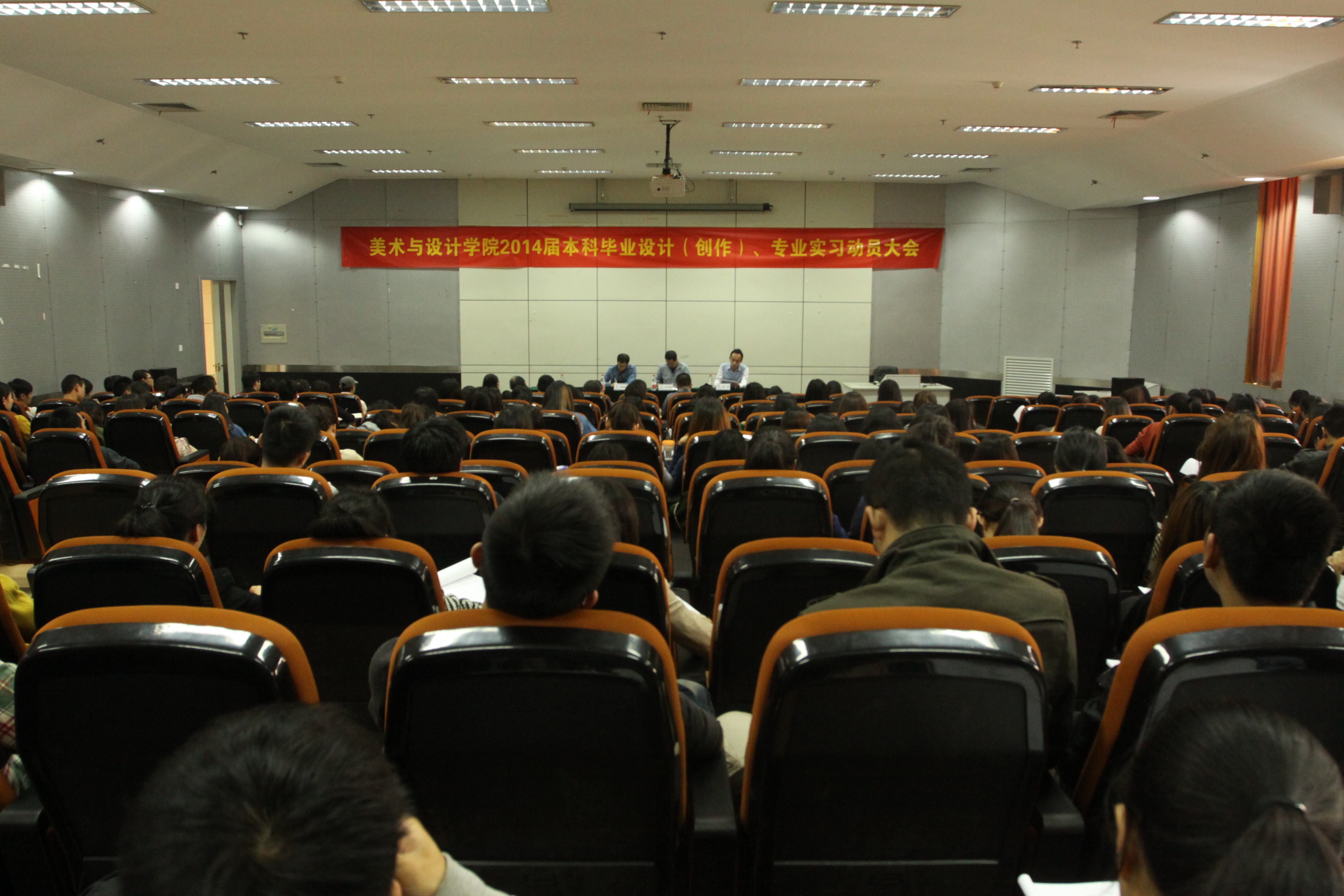 为顺利开展2014届毕业设计工作,11月8日上午,万象城awc8882014届本科毕业设计(创作)、专业实习动员大会在学校会展中心叶适厅举行。学院副院长蔡可群老师,副书记杨振海老师,教学科邹青老师,及美术、设计、服装三个系的系主任、各位毕业设计指导老师及全体14届本科毕业生参加了会议,会议由邹青老师主持。