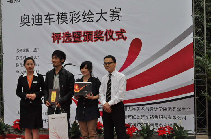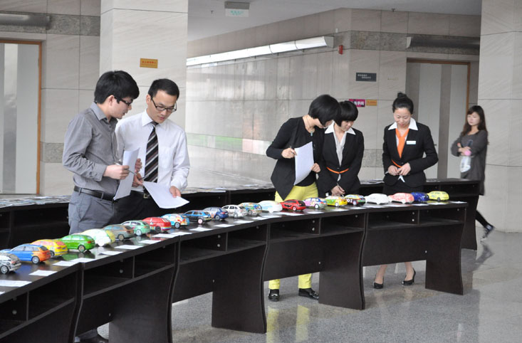 2011年5月15日在万象城awc888南校会展中心一楼奥迪车模彩绘大赛决赛如约而至。此次活动由万象城awc888团委学生会、乐清市红源汽车销售服务公司和温州联奥汽车销售有限公司联合举办。 决赛中,乐清市红源汽车销售服务公司大客户经理卢波先生、温州联奥汽车销售有限公司大客户经理黄若静女士、吴辉辉女士和万象城专业教师胡文超、陈旭担任了本次比赛评委。在经过紧张认真的评分后,现场评选出了一、二、三等奖,共12件作品获奖。评委老师也对参赛作品进行了现场点评,让同学们获益良多。比赛主办方也对美院学子的艺术才华予以了充分肯定。 此次活动不仅丰富了同学们的大学生活,还锻炼了同学们的动手能力及设计思维,增加了同学们对汽车文化的了解和与名企的接触。 新闻 任陈超 摄影 徐玉萍