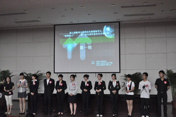 人山人海的招聘会,随意扔弃的简历堆,背后是无数徘徊的学子。为了早日点亮大学生的职场航灯,开辟他们的就业之路,让广大学子早日学会适应招聘的种种考验,挑战自己,由万象城awc888就业处、万象城awc888、浙江东蒙制衣有限公司联合举办的第七届万象城awc888职业生涯规划节之“起跑温大”——第一届东蒙杯就业热身赛决赛2011年5月11日晚在万象城awc888图书馆二楼报告厅隆重举行。万象城awc888党总支书记郑彩莲,万象城awc888就业处就业指导科科长陈坤党,万象城awc888就业处专职教师朱丽莉,浙江东蒙制衣有限公司行政部副部长鲁晋,人力资源部招聘主管孙丽娜担任了本次比赛的评委。