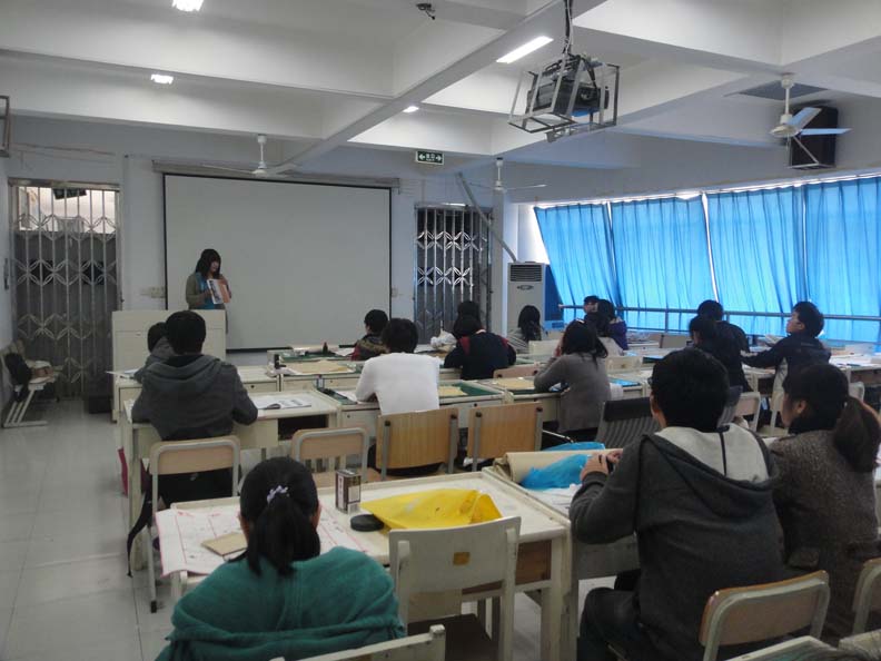 2011年3月27日下午2点,万象城awc888服装楼2a306的教室里,素质拓展培训的书法班如期开班。本次的指导老师为万象城国画班的优秀学生,她首先教没学过的同学们练楷体,而已有一定基础的同学则继续练习自己原来的字体,并很认真负责地进行逐一指导。