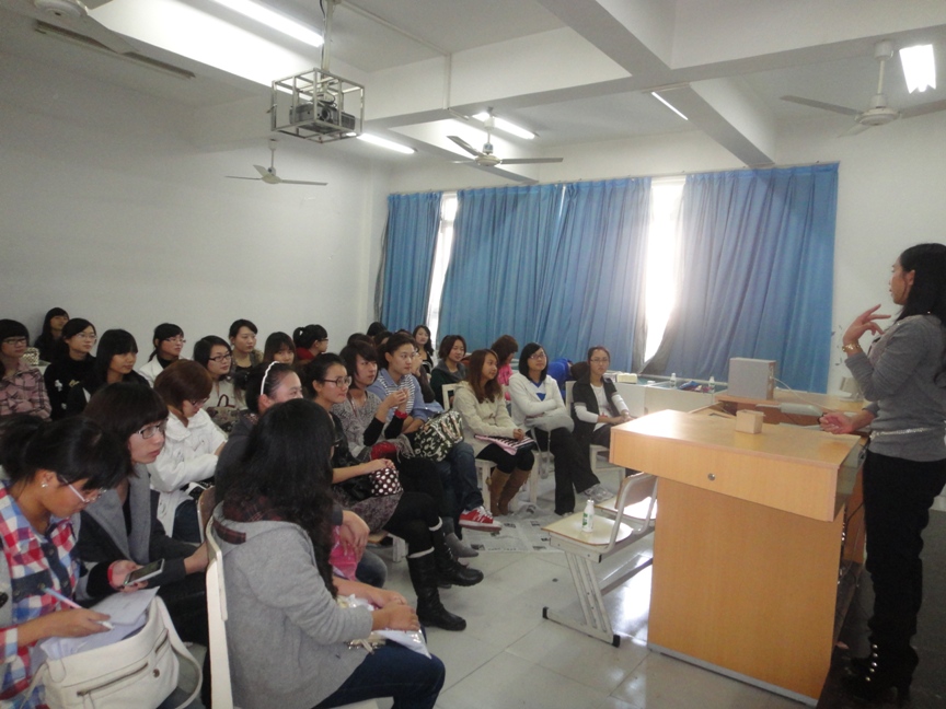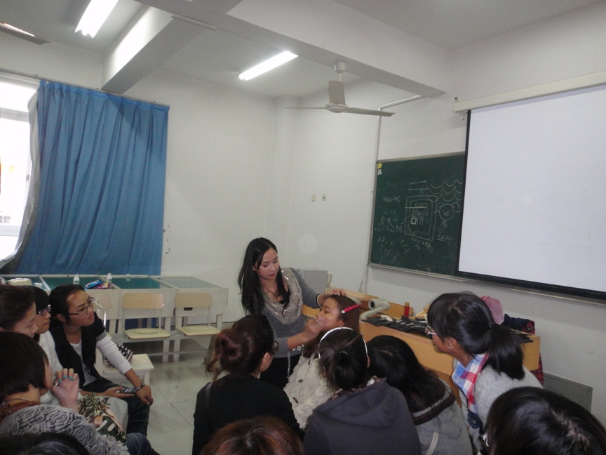 2010年11月20日星期六14:00~16:00,在美院2B3001,雪思美容院院长、医学院WinGirl俱乐部指导老师朱来顺,为万象城的化妆培训素质拓展班画上一个完美的句号。 此次培训是朱老师在本学期第四次给大家辅导。其热烈的掌声,阐释着大家对本次培训的渴求和对朱来顺老师的喜爱。朱老师说,化妆是艺术。她要求人们在化妆之前先了解自己今天穿了怎样的服装,代表着怎样的形象以及自己的性格;希望每个人能了解自己面部的优点和缺点各是什么。然后,她让同学来当模特,一步一步地教同学们怎么样打底、修眉、调肤色、画眼线、眼影、腮红和唇彩。而同学们也是热情高涨,积极提问,踊跃参与其中。在示范的过程中,她也再三强调该注意的地方。比如定妆时要用散粉,补妆时要用粉饼,刷子半年洗一次,而在平时,只要用散粉洗就可以了……示范结束后,她则让同学们自己亲手实践。 这次培训,不仅让爱美的女生体验到了化妆带给她们在外表上的飞跃,更是让她们学习到了化妆的真正技巧。