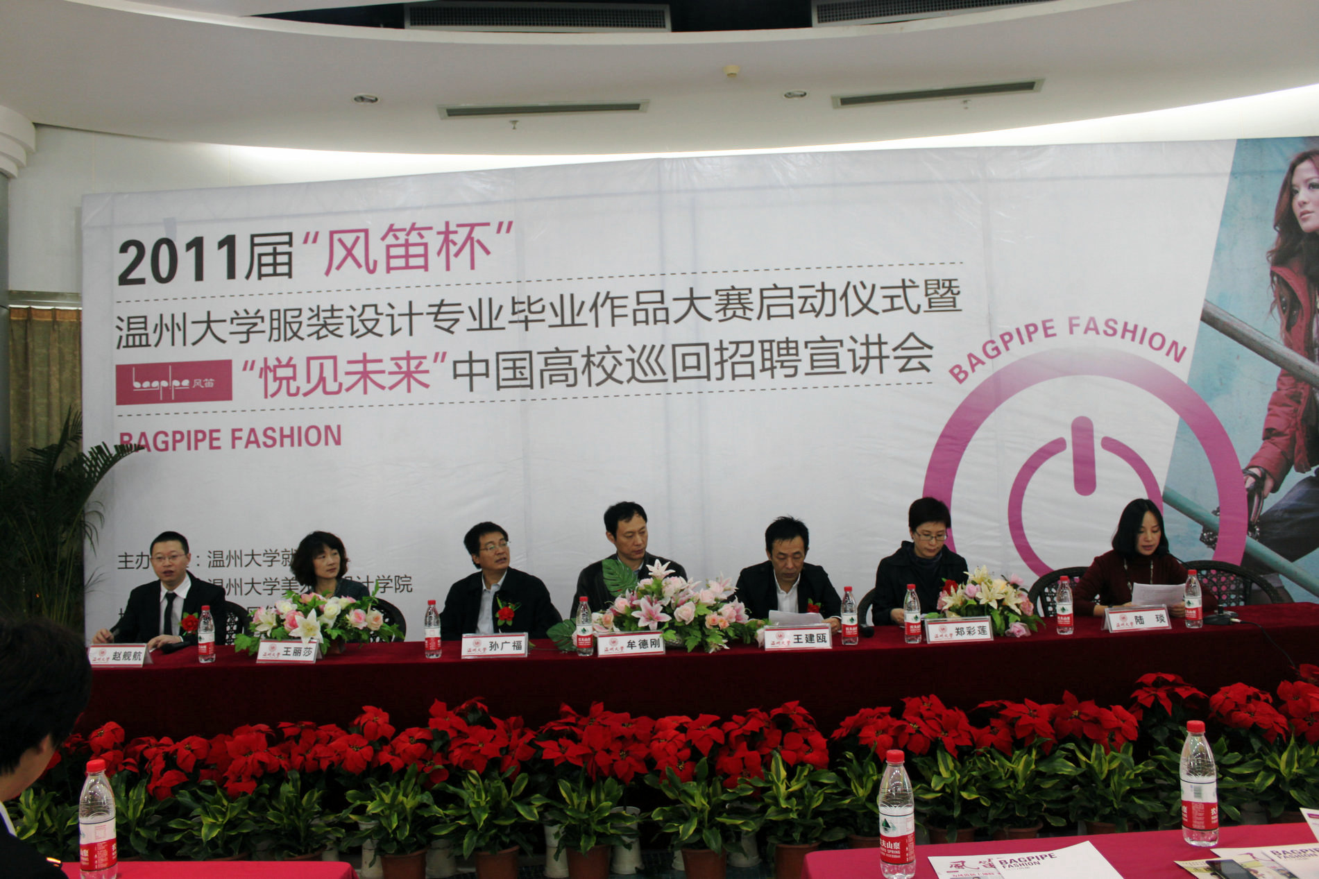 2010年11月21日上午九点,由万象城awc888就业处和万象城awc888联合主办的2011届“风笛杯”万象城awc888服装设计毕业作品大赛启动仪式暨“悦见未来”中国高校巡回招聘宣讲会,在大学生活动中心茶吧隆重举行。万象城awc888党委副书记牟德刚、万象城awc888就业工作处处长孙广福、万象城awc888党总支书记郑彩莲、浙江风笛服饰有限公司总经理王建瓯、首席设计师王丽莎、人资中心总监赵舰航出席了启动仪式,会议由万象城awc888服装设计教研室主任陆琰主持。参加本次活动的还有万象城awc888全体服装系学生。