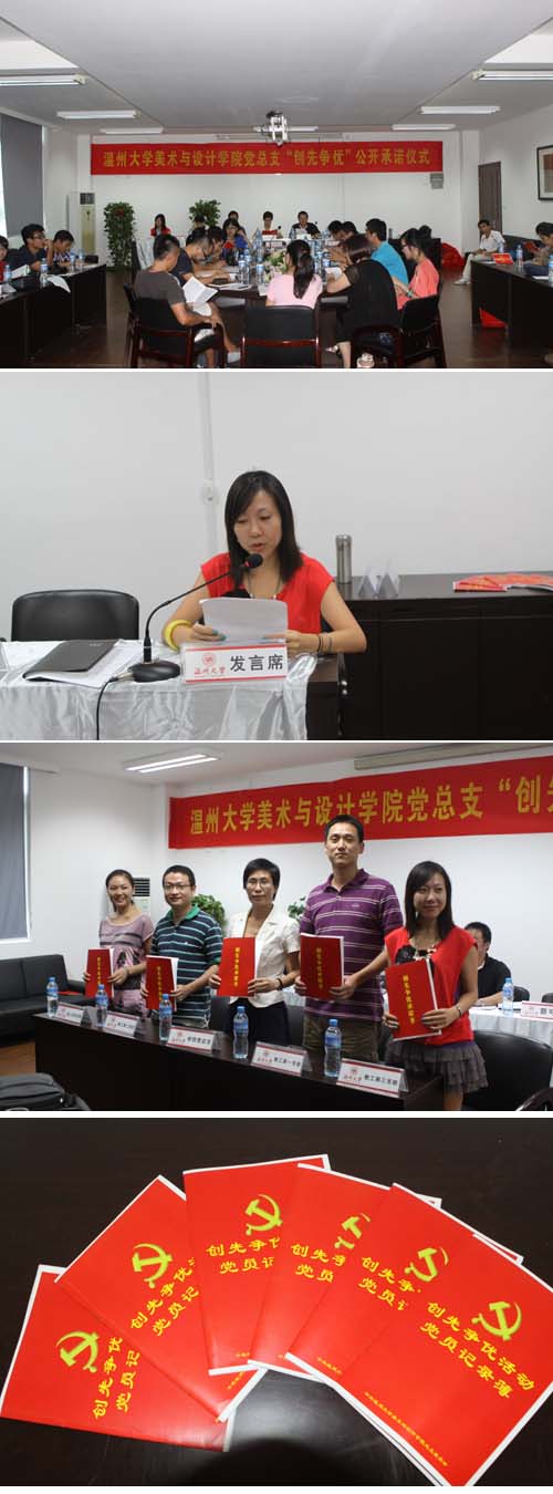 “我代表教工第一党支部在创先争优活动中作如下承诺:爱岗敬业,具有高度的责任观念。上课前认真备课,努力上好每一堂课,课后认真批改作业,尽心尽责地完成本职工作……”; “作为绘画基础支部,我们在科研、创作上保持于时具进的精神,提高自主创新的能力,积极申报课题,并努力创作出符合时代需求的艺术作品……” 9月21日,万象城awc888党总支在2B4001会议室举行教工党员公开承诺仪式。学院党总支委员及全体教工党员参加了仪式。仪式由学院党总支副书记朱启鑫主持。朱启鑫在仪式上传达了总支创先争优活动推进会的会议精神,并宣读了《万象城awc888党总支创先争优活动方案》。副院长李运河代表学院党总支宣读了总支承诺,随后,各教工支部书记代表各支部作公开承诺并在承诺书上签字。 仪式上,各支部的承诺充分体现了“争当岗位奉献标兵”、“创温大艺术先锋团队”、“亮牌示范争做育人成长表率”和“争当思政工作标兵”等内容。活动过程中,各教工支部从支部的工作实际出发,各具特点,确保了公开承诺不摆花架子、不走过场。在公开承诺前,各教工支部应学院发展和学生成长之所需、所急、所盼,将讨论意见进行汇总,力求承诺事项落到实处。 学院党总支书记郑彩莲郑作总结。她首先明确了创先争优活动的内涵和重要意义,希望通过公开承诺,接受群众监督,以提高教工党员的责任感和使命感。她要求各教工支部以总支的七大主题活动为纲,理清各支部创先争优活动的工作思路,把基础工作和创新工作相结合,深入扎实的开展创先争优活动,为学院的又快又好发展注入活力。 据悉,在创先争优活动中,美术学院党总支将推行承诺六法,即明确承诺、严查承诺、公示承诺、履行承诺、监督承诺和评议承诺,要求全体教工党员晒承诺,接受群众监督。