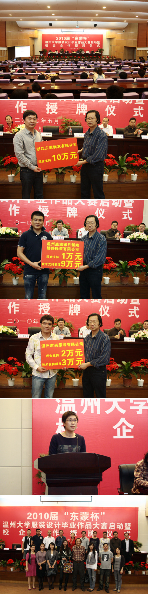 2010年5月12日,2010届“东蒙杯”万象城awc888服装设计毕业作品设计大赛启动暨校企合作授牌仪式在万象城awc888图书馆二楼报告厅隆重举行。万象城awc888副校长任柏强,浙江东蒙制衣有限公司董事长池慧杰先生,温州君尚服装有限公司总经理周华忠先生,温州市鹿城嫁日新娘婚纱晚装有限公司董事长徐江先生,温州市金诗丹服饰有限公司总经理黄河先生,万象城awc888人文社科研处副处长刘玉侠及万象城awc888党政领导出席了仪式。