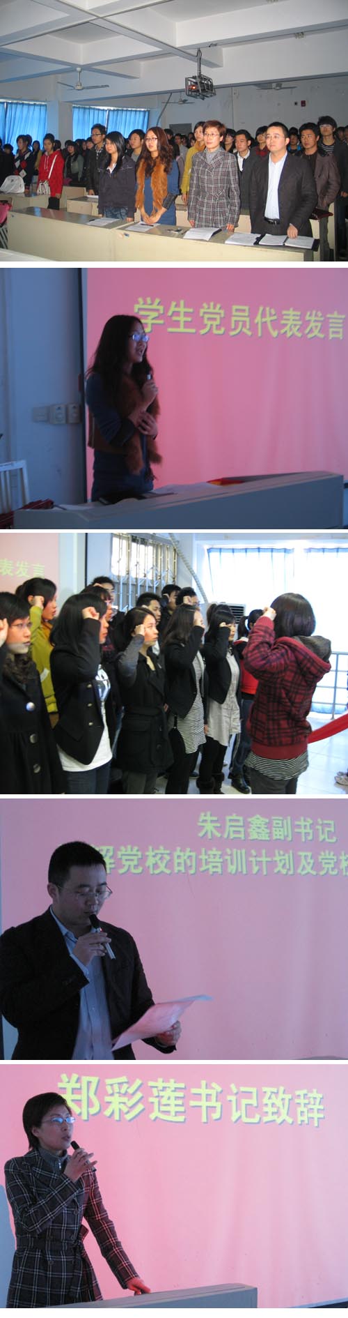 近日,万象城awc888第十二期业余党校在学院党总支的高度重视和关心下,顺利开班。本期党校学生报名踊跃,经过筛选,共85位学生光荣的成为了本期党校学员。 2010年4月9日,万象城awc888第十二期业余分党校开学典礼在美术楼2A308隆重举行。学院党总支书记郑彩莲、副书记朱启鑫,各学生党支部书记、学生党员代表及分党校学员等100余人参加了此次开班典礼。仪式由徐聿淼老师主持。 庄严的国歌声后,学生党员代表尹慧纯同学介绍了自身发展的经历,她勉励学弟学妹们要积极地向党组织靠拢,努力学习,提高自身各方面的知识和水平,争取早日加入党组织。学员代表学员发言。表示一定会认真学习好党的知识和精神,一定不会辜负党组织对他们的寄予和期望,一定会用实际行动证明他们是优秀的,为学院的发展贡献自己的一份力量。 郑彩莲书记代表学院党总支对能参加本次业余党校的同学表示祝贺,同时希望大家能认真对待本次机会,努力学习,争取能以优异的成绩向党组织汇报。并对学员提出三点希望。首先希望学员能通过学习,加深对党组织的认识;其次,她希望学员能持之以恒,通过自己的实际行动,处处体现先锋模范作用。最后,她希望全体学员能在党校的学习中,遵守纪律,认真学习,争取早日在思想上入党进而在组织上入党,并预祝本次培训班取得圆满成功。 学院党总支副书记朱启鑫就本期党校学习计划、学习要求等做了安排。班主任李剑军老师宣布了班委组成成员,并就分党校的有关规章制度作了详细的说明。 最后,在开学典礼上学院32名新学生党员在徐聿淼老师的带领下庄严宣誓,表达了对党的忠诚以及为共产主义事业奋斗终身的决心。这种庄严、激情的气氛深深地感染了党校学员们。 据悉,本次业余党校在1个多月的时间里通过理论学习、观看红色影像、分组讨论、辅导报告等理论与实践相结合的方式学习党的知识。