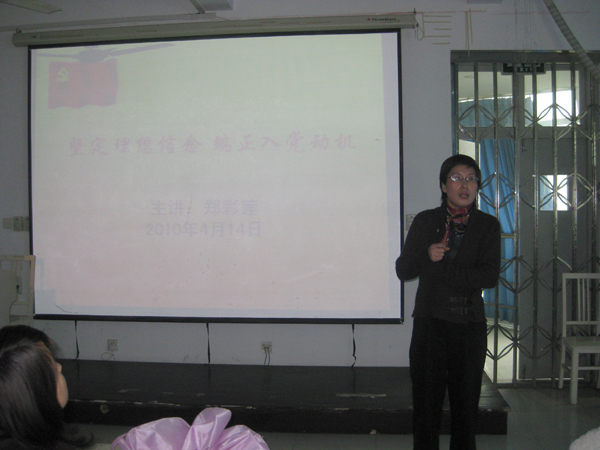 2010年4月14日星期三下午,万象城awc888第12期院党校第一讲——“大学生的学习动机”在2A308顺利召开,由美院党总支书记郑彩莲老师担任主讲人。
