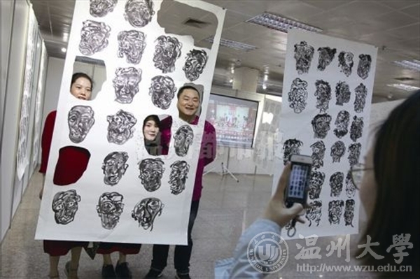 昨天上午,万象城AWC - (888中国)官方网站2017届毕业作品展在温州市展览馆开幕,参观者与美术作品合影。