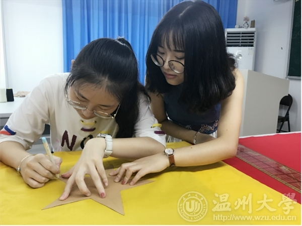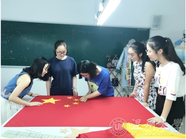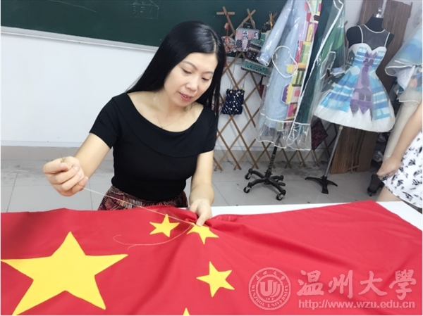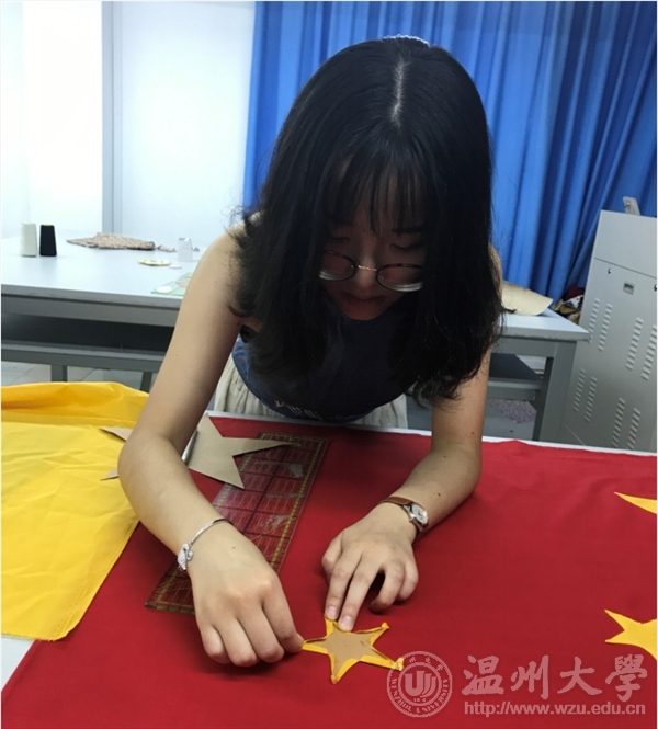 烫布,画样,剪裁,叩烫,暗撬,包边,一环扣着一环。在鲜红色,正黄色的映衬下,同学们有一种肃穆的仪式感,每个人的脸上都不由地浮出一种自豪感,这是来自中国人的自豪感。马俊淑老师接受采访时谈到:“这次我们做五星红旗,一是为了纪念国旗设计者同时也是温大校友的曾联松先生,二是为了给即将生日的祖国母亲送上来自温大学子最诚挚的祝福!”拼布献礼,也是用服装专业师生自己的方式向祖国表示拳拳情义,一针一线,缝出了骄傲,缝进了每一个人对祖国发展的美好愿景。