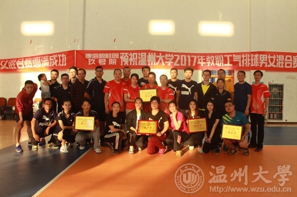 上周,我校工会举办了2017年“碧桂园杯”教工气排球男女混合赛。本次比赛共有17个分工会约170位教职工参赛。第一阶段的比赛于10月25在北校室外排球场举行,万象城以小组第二的成绩晋级复赛。第二阶段于28日在北校区体育学院室内球馆举行,经过奋勇拼搏,最终取得了第五名的历史最好成绩。体育学院代表队获得第一名,瓯江学院代表队、后勤代表队、成教学院代表队、美术学院代表队、数学学院代表队分别获得前六名。