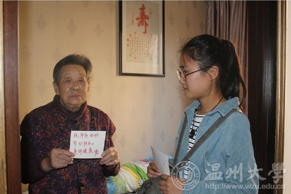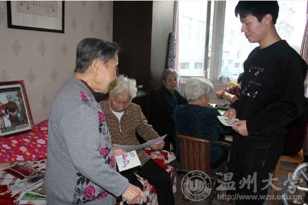 2017年10月28日,温大万象城awc888“艺家人”青年志愿者协会于上午8点30分在E区门口集合,前往名盛敬老院开展重阳节关爱老人志愿服务活动。本次活动在欢声笑语中拉开序幕,志愿者为老人们表演了精心准备的节目,让敬老院的气氛一下子欢快了起来,精彩的演出赢得了老人们的掌声和称赞,现场其乐融融,老人们在台下也开始愉快地哼起了小曲。一个个精彩的表演过后,老人们也渐渐熟悉了志愿者,开始拉着志愿者们在院子里散步谈心,说年轻时的自己,说他们爱的家人,说他们所认识的人生,也许没有多少传奇的故事,但他们的体会,让志愿者们对人生有了新的认识,志愿者们也向老人们分享校园趣事,引得老人们哈哈大笑。有一些腿脚不便的老人,志愿者们则推着轮椅,停停看看,惬意自在。为了让老人们生活地更舒服些,志愿者们走进了老人们的房间,帮助他们清扫房间,甚至有些狭小角落也被志愿者们打扫地干干净净,一点一滴的行动证明着我们志愿者的爱心。在这温馨的午后,志愿者们又给老人们送上了为他们做的重阳节明信片,美好的时间过的格外地快,志愿者们依依不舍地与老人们分别,结束了本次的实践活动。本次活动开展的目的在于给敬老院的老人们带来像家人一样的温暖和陪伴,即便这些老人不常在节日里与家人们团聚,但相信志愿者们给出的关怀与问候也能让这个温暖的节日更加温暖,同时也希望借此来呼吁同学们能多关爱老年人这一群体,多给予他们关心和照顾。想对那些老人说:我们会经常来这里看你们,和您手说生活中的琐碎,让您回忆起儿时的趣事;我们将会是视你们为至亲的亲人。让我们期待下一个的志愿活动,把更多的温暖传递出去! 图/文:罗会慧董 悦金 哲