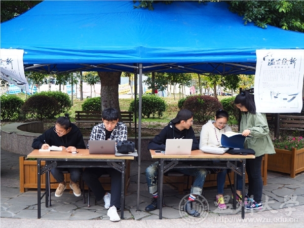 为了加强活动的宣传力度,11月19日中午,美院团委学生会的同学在学生宿舍E区大榕树下开展“温古绘新”插画大赛活动的现场报名,对驻足浏览海报的同学进行热情地宣传和介绍。通过工作人员现场对活动海报的解说,同学们更好的了解到了本次活动的意义所在,并激发了同学们对此次活动的参与热情。为后期大量优秀作品的成功收集打下基础。
