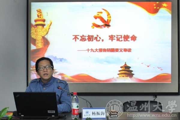 2017年11月24日中午,美院党总支副书记杨振海为全体团学干部作题“不忘初心、牢记使命——十九大报告精髓要义导读”的形势与政策讲座。 杨书记对十九大报告的主题、过去五年的工作和历史性变革、新时代中国共产党的使命、新时代中国特色社会主义思想和基本方略等十三个方面以及十九大的意义进行了详细分析和讲解。在杨书记的细致讲解下,同学们都获得了深刻的感悟与体会。杨书记指出,党的十九大是在全面建成小康社会关键阶段、中国特色社会主义发展关键时期召开的一次十分重要的大会,对鼓舞和动员全党全国各族人民继续推进全面建成小康社会、坚持和发展中国特色社会主义具有重大意义。作为高校学生干部学习和践行十九大精神的目的,是要不忘初心,牢记使命,努力充实文化知识和专业技能,为实现中华民族伟大复兴的中国梦贡献自己的力量。 最后,杨书记强调,作为新时代的大学生要时刻怀揣爱国敬业的心,在日后的工作中努力奋进,更好的完成自己的工作,为实现中华民族伟大复兴的中国梦,实现人民对美好生活的向往继续奋斗。