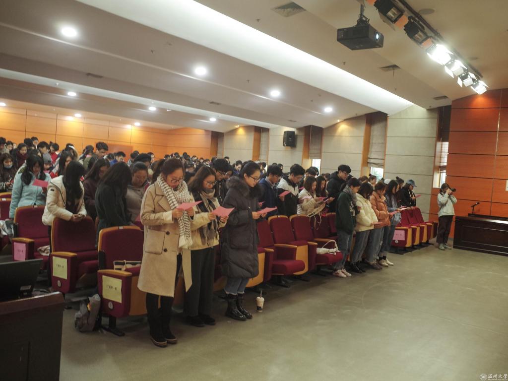 2018年1月10日下午,万象城awc888在雁山厅召开2017-2018学年第一学期考风动员大会,万象城awc888党总支书记张丽萍、副院长谢子静出席大会,17级全体同学参加会议,大会由学院党总支副书记杨振海主持。 张丽萍书记在动员讲话中重申了考风考纪的重要性和作弊的危害性,她强调学习在于平时的点滴积累,来不得弄虚作假,作弊不能弥补学习上的漏洞,而是一种自欺人人的行为。张丽萍书记还鼓励同学们认真备考,争取考出好成绩。她强调:“大学里的每一次考试都是接受考核认证自我的途径,加强考风建设营造公平的考试氛围,既是每个同学的愿望也是每个同学应该肩负的责任。所以希望同学们在这次考试中能诚信做人,亮出真实的成绩,展现真实的自己。”杨振海副书记根据学生手册相关条例告诫同学们一定不能碰这个底线,在考试过程中不仅仅要交出反映专业知识水平的考卷,更重要的是在考试中要交出诚信的品行之卷。 17级全体同学在学生代表的引领下宣誓,承诺端正考试态度认真复习积极备考。 学生处吕乐老师进行大学生文明修身考风考纪专题讲座。学生处吕乐老师通过精彩的演讲和亲切的互动,加深了同学们对考试作弊的危害的理解,相信同学们也一定会用真实的成绩证明自己的实力,成为一名诚实守信的大学生。 大会还总结了本学期学风考勤和晚自习考勤情况,与会领导对本学期优秀纪检委员进行了表彰。