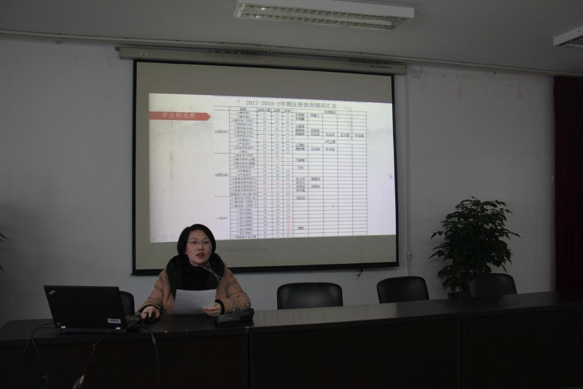 学生科叶筱卉老师公布了2017-2018学年第一学习学院优秀班干部、工作积极分子名单和开学初学生返校情况,并对开学初班主任工作进行了布置:各班班主任要在第二周内召开本学期的第一次主题班会并按时上交《主题班会记录表》;班主任要深入了解并掌握学生春节期间、开学初学生的思想、学习、生活等各方面情况,积极配合学校开展开学初学生思想动态网上调查,及时发现学生存在的思想和认识问题,反馈学生反映强烈的意见和建议;新学期要营造浓郁的学习氛围,进一步加强学风建设,落实“课堂拒绝手机”制度,鼓励班级同学参加“五班十星”评比。毕业班班主任要重点关注毕业生返校和入住情况, 准确掌握未及时返校的毕业生的去向和动态,并做好在外实习安全教育工作,在外实习毕业生务必填写《万象城awc888毕业班学生报到注册联系单》。关于学工系统的数据维护,班主任要及时将与学生的谈话情况录入学工系统,并提醒学生在学工系统中及时更新个人联系方式等信息。