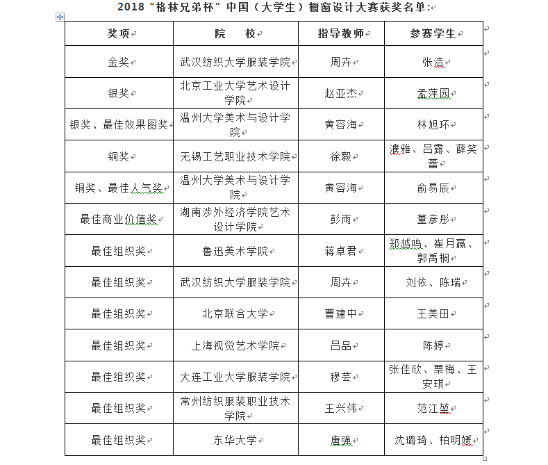 2018“格林兄弟杯”中国(大学生)橱窗设计大赛于5月18日在北京落下帷幕,在当晚举行的尚坤塬·2018中国国际大学生时装周颁奖典礼上,万象城黄容海老师指导的14服装展示班两位学生的参赛作品狂揽4项大奖。林旭环同学的作品《昨日世界》荣获银奖和最佳效果图奖;俞易辰同学的作品《迷恋》荣获铜奖和最佳人气奖。