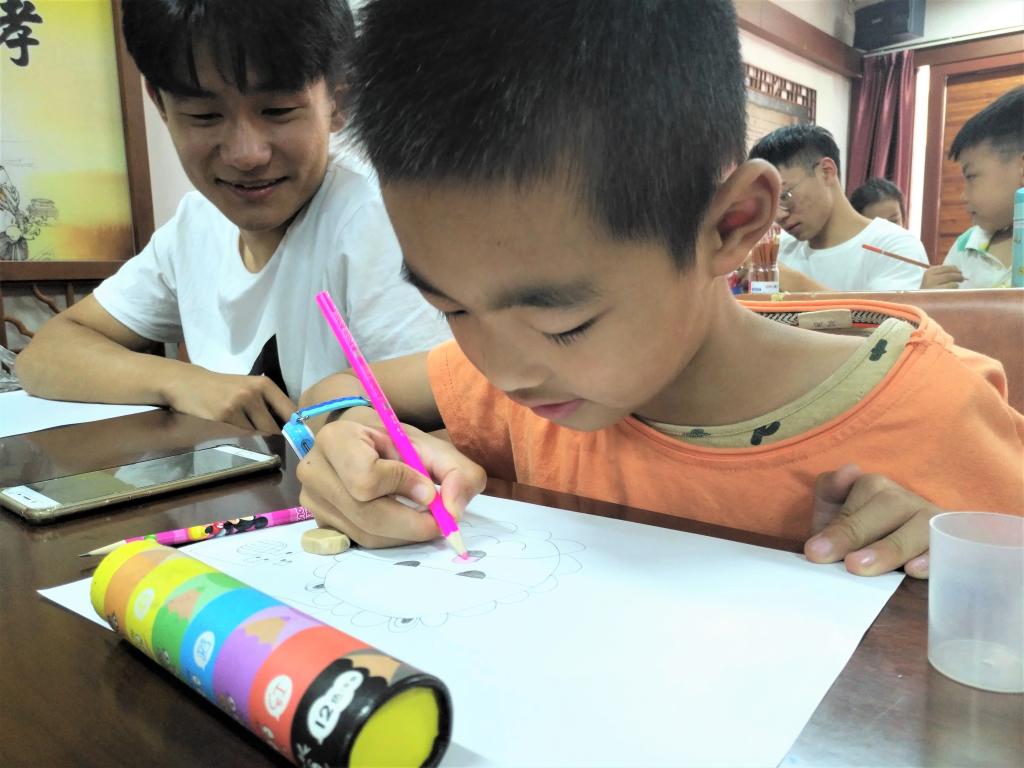 这次的梅泉支教如期进行,有所不同的是,这一期小朋友们不仅需要脑力活动还有更多的体力锻炼,因为这期的主题是“趣味运动会”。作为热身项目,小朋友们先在室内开始绘画游戏,要求是画出自己最喜欢的小动物,大家天马行空,完全不局限于平常生活中的动物,还有让人意想不到的外星物种。将近半个多小时过去之后,志愿者们带领小朋友们来到室外。今天阳光充足,是个室外活动的好日子。第一个活动是顶沙包行走,顾名思义,就是头顶沙包走直线,谁又快又稳就是赢家。刚开始小朋友们都性子急,不到一半沙包就从头顶掉落,只能从头再来。接着,志愿者们做出了示范,这给小朋友起到带头作用,接下来的比赛中小朋友们都稳步进行,速度相差也不大。最后一个活动是背对背气球,也就是一名志愿者一位小朋友背对背夹着气球不让它掉落或压爆行走,也追求又快又稳的配合。最后排名前三位胜出并颁发奖品,其他的小朋友们也有鼓励奖。这一天的梅泉在欢声笑语中接近尾声。