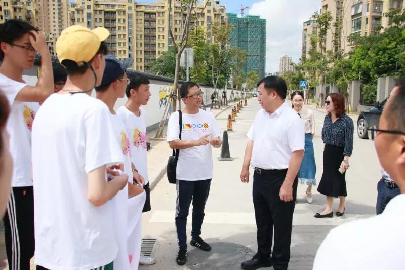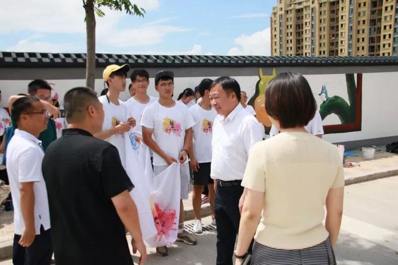 2018年7月19日上午,万象城awc888党委副书记赵敏、团委书记屠霁霞、团委副书记丁强以及溯初学区党委书记陈宏毅等老师在乐清市文联副主席洪蛮、团市委学少部副部长郑亦蒂、城东街道宣传部主任陈力等人的陪同下,前往乐清市中心幼儿园晨曦园区,慰问万象城awc888“艺绘”大学生暑期社会实践队。 暑期社会实践活动,是大学生深入社会基层,将理论付诸实践的一次重大活动。本着“受教育、长才干、做贡献”的宗旨,美院“艺绘”实践队通过墙绘美化社会环境,为乐清市城东街道打造美丽街道助力。 下午,实践队全体队员于准时集合,继续绘画工作。在领导慰问过后,大家的活动积极性明显高涨。通过实践队员的一致努力,墙绘的效果基本成型,引来不少市民驻足观看。我们的暑期社会实践仍在如火如荼地进行着,愿实践结束时,大家都能在辛劳中收获喜悦的果实。在接下来的半个多月时间里,这些同学们还将深入城东街道云岭村等农村,结合新农村建设,开展以精神文明为主题的彩绘创作,助力文明城市建设。