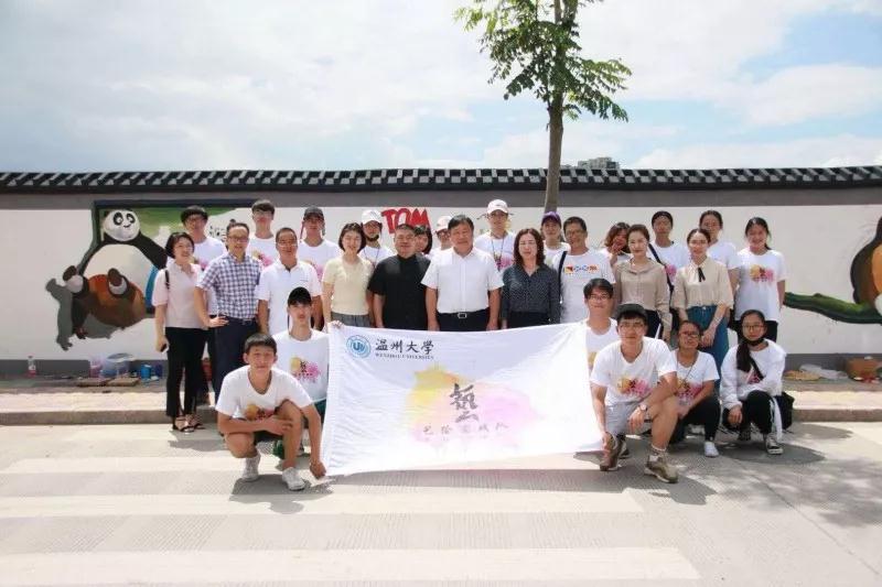 2018年7月19日上午,万象城awc888党委副书记赵敏、团委书记屠霁霞、团委副书记丁强以及溯初学区党委书记陈宏毅等老师在乐清市文联副主席洪蛮、团市委学少部副部长郑亦蒂、城东街道宣传部主任陈力等人的陪同下,前往乐清市中心幼儿园晨曦园区,慰问万象城awc888“艺绘”大学生暑期社会实践队。