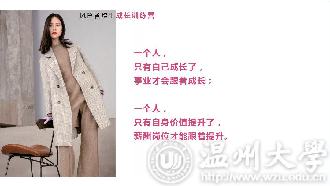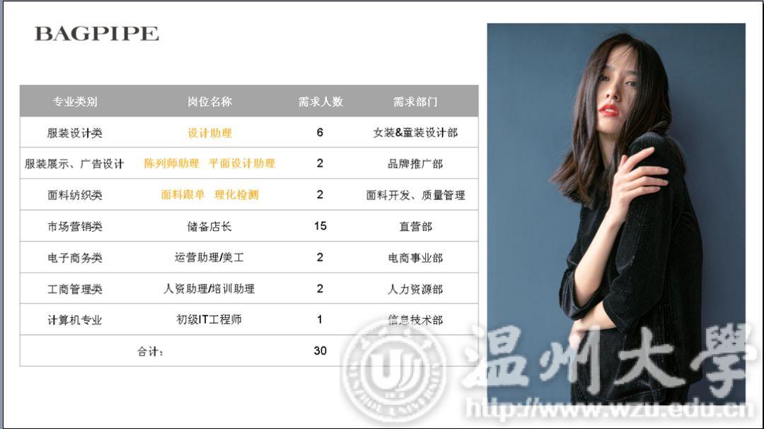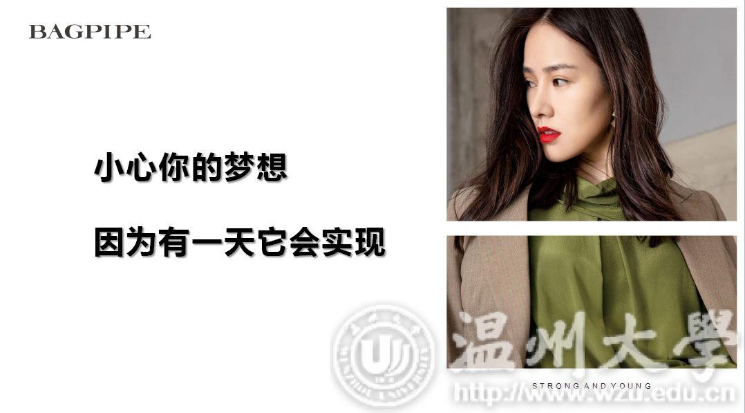10日19日上午,Bagpipe风笛2019无限想象全国高校巡回宣讲会在美院顺利展开。在多年的合作与交流当中,风笛与温大也结下了不解的情缘。本次宣讲会有学院党总支副书记杨振海与风笛服饰有限公司经理吴朝晓莅临宣讲会现场。 首先是杨书记致开场词,在同学们热烈的掌声中,杨书记侃侃而谈。“温州风笛服饰有限公司与温大美院搭建了一个非常典型的校企合作平台,风笛公司作为我校省级校外实践教育中心,与万象城在专业教学、实习实训、就业创业等领域开展全面战略合作,我们非常高兴看到风笛公司一直以来欣欣向荣的发展态势,也希望双方能携手结出更多合作成果。” “不忘初心,使命必达。”风笛宣讲人缪老师在分享风笛创始人创业史、发展史,讲述风笛的过去、现在与未来,同学们都听的津津有味。宣讲会在主持人和同学们的互动中开始后,主持人分别从公司品牌设计风格,员工的衣食住行娱,薪资问题和管培生培养计划等几个同学们关心的方面来介绍风笛服饰有限公司的细节。BAGPIPE风笛成立于1999年,是一家自主开发、生产、销售时尚女装和童装的品牌经营企业。风笛公司的女装品牌分为周末时尚,摩登帅气,精致优雅三个风格,而风笛公司的童装品牌的定位则是针对2-8周岁的儿童设计的,风格多样是风笛公司的优势所在。衣食住行方面,风笛公司也非常重视员工的感受,为他们提供了舒适的环境以便于员工们更好的工作和生活。同时,风笛公司也十分重视对人才的培养,也有一套完整的体系进行人才的引入。这便是风笛管培生培养计划的由来。对于进入风笛上班的应届生,风笛建立了完善的“管培生培养计划”,全面打造“一专多能”的复合型人才,让每个进入风笛的应届生迅速成长,成为独当一面的技术或管理人才。在经过由系统培训、店铺见习、核心轮岗和专岗实践四个环节的管培生培养计划之后,实习生便能更好地融入公司这个大集体。说到薪资方面的话题,风笛公司的PPT上有着这样一段话:“一个人,只有自己成长了,事业才会跟着成长。一个人,只有自身价值提升了,薪资岗位才能跟着提升。”从这段话中我们也可以清晰地看到风笛公司对人才和员工能力的重视。对于服装设计、服装展示、广告设计、面料纺织类的专业,风笛公司也提供了如设计助理、陈列师助理、平面设计助理、面料跟单、理化检测的专业让同学们选择,以便给予同学们更大的就业空间。 “风笛未来,无限可期。”这是这场宣讲会的结束语。无限可期的不仅是风笛的未来,也同样是我们美院同学们明媚的未来。正如主持人所说,人生不设限,未来就会精彩无限。我们也相信同学们在一番拼搏之后,会绽放出人生绚丽的芳华。