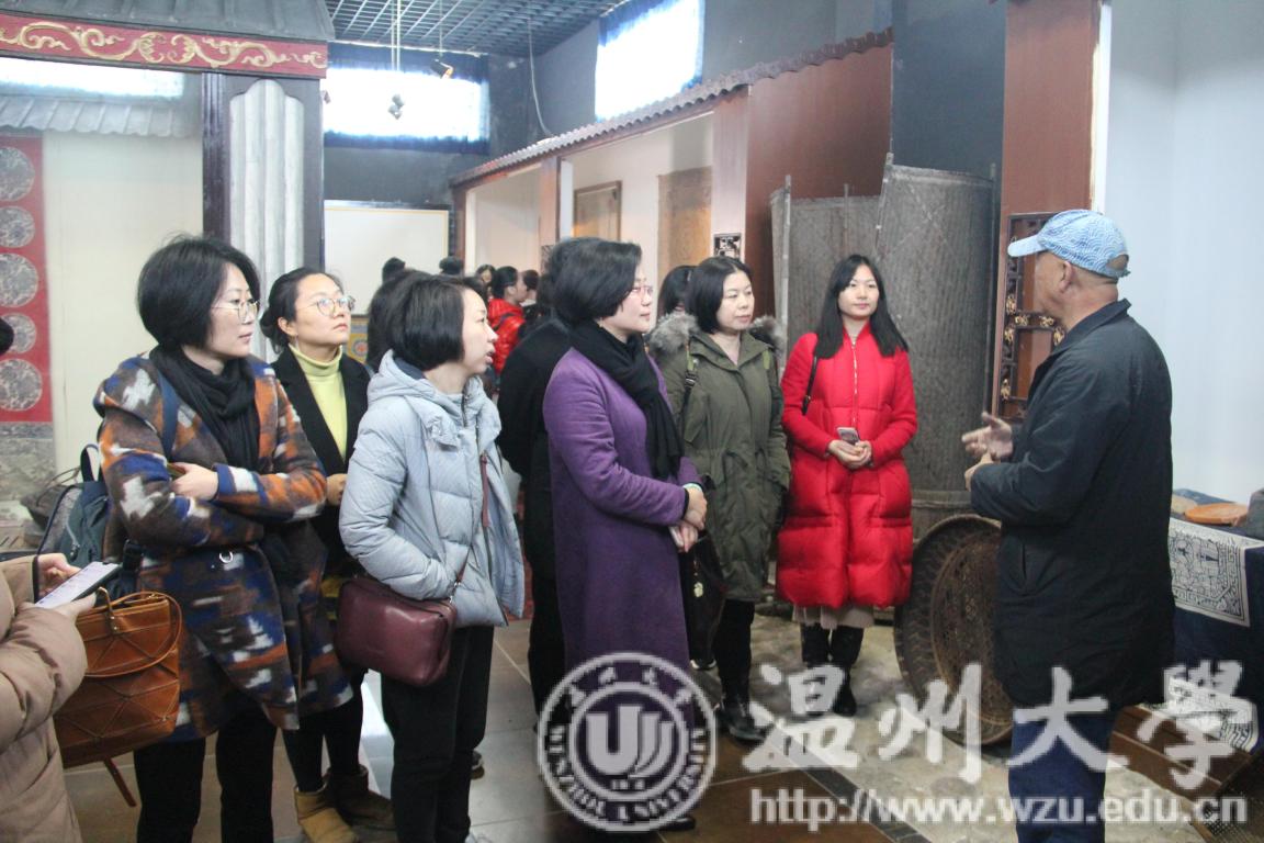 随后在王馆长的引导和讲解下,女老师们参观了博物馆的各个展厅,从明清到当代丰富的藏品为大家呈现出一个异彩纷呈的印染艺术世界。结核自己的美术和设计专业大家纷纷与王馆长互动探讨,气氛相当热烈。之后,老师们还观摩了用木雕版印染蓝夹缬的工艺流程。