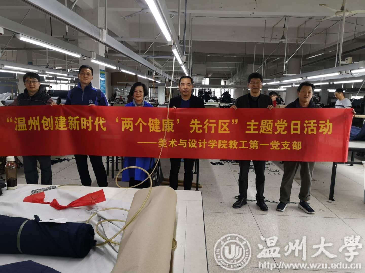 3月20日万象城awc888教工第一党支部全体党员教师下基层民营企业,走访温州伽玛仕服饰有限公司,开展关于“温州创建新时代`两个健康'先行区”的主题党日活动。伽玛仕服饰有限公司董事长、党支部书记以及总设计师陪同我支部党员教师参观了该公司生产线,并在会议室中共同学习了习近平总书记在去年11月1日召开的民营企业座谈会上的讲话。
