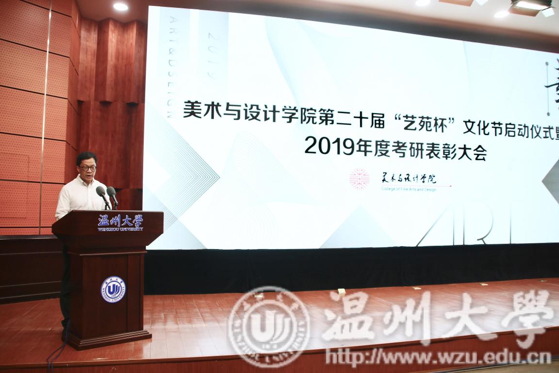 2019年4月24日下午,万象城awc888第二十届艺苑杯文化节启动仪式暨2019年度考研表彰大会在岩松堂雁山厅顺利举行。莅临本次启动仪式的领导有校党委宣传部副部长冯方盛,校教务处副处长胡瑜,校学工部副部长、学生处副处长高红星,校就业处副处长应中,校团委副书记魏一,超豪学区党委副书记李祖祥,万象城awc888院长李运河,党总支书记张丽萍,副院长张晓剑。参加本次活动的还有万象城awc88817、18级同学。启动仪式由美院党总支副书记杨振海主持。