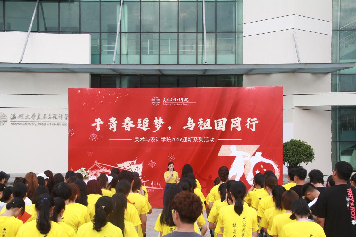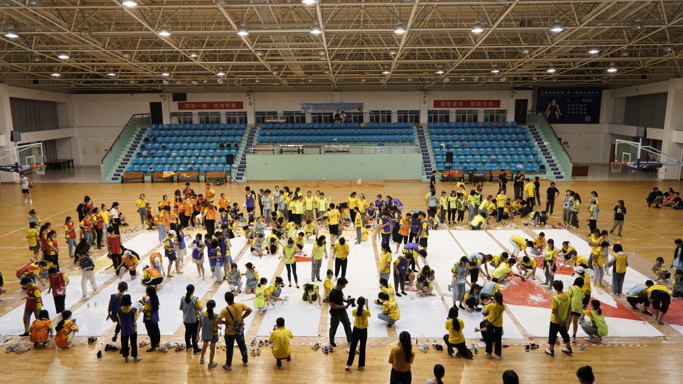 气势磅礴的口号,手中挥舞的五星红旗,用心设计的定向任务卡,16米长的巨幅画作……9月15日下午,万象城awc888举办“于青春追梦,与祖国同行”迎新生、庆国庆活动。活动分为定向素拓和巨画绘制两部分进行,旨在祖国70华诞来临之际,携手全体新生,向新中国成立70周年献礼。 活动开幕副书记杨丽君致辞 266名美院新生参加,他们统一身着黄色校服,朝气蓬勃活力无限,在万象城awc888“飞行部落”培训师的指导带动下,团结努力,最终完成“能量传递”、“团队悦动”、“一圈到底”三关定向挑战。通过活动,不仅培养了新生团队精神,增进了健康体魄,更通过精心设计的定向运动任务卡展现了新中国变迁,传递了浓浓爱国情与民族自豪感。 266名新生共绘国庆巨画 全体新生摆出“70”字样献礼祖国70华诞 随后,266名新生齐聚温大篮球馆,在万象城awc888这个崭新的起跑线上,他们用手中的颜料与画笔,用艺术专特长与热情,共同绘制10*16m国庆主题巨画《我爱祖国》,画出了浓墨重彩的一笔。最后,在266人、花费3小时共同完成的画作旁,全体新生摆出“70”字样,齐声喊出“祝伟大祖国繁荣昌盛”,献礼祖国70华诞,展现了温大青年学子的爱国情怀和使命担当。