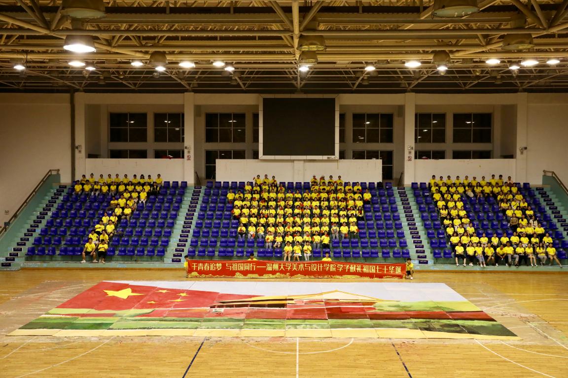随后,266名新生齐聚温大篮球馆,在万象城awc888这个崭新的起跑线上,他们用手中的颜料与画笔,用艺术专特长与热情,共同绘制10*16m国庆主题巨画《我爱祖国》,画出了浓墨重彩的一笔。最后,在266人、花费3小时共同完成的画作旁,全体新生摆出“70”字样,齐声喊出“祝伟大祖国繁荣昌盛”,献礼祖国70华诞,展现了温大青年学子的爱国情怀和使命担当。