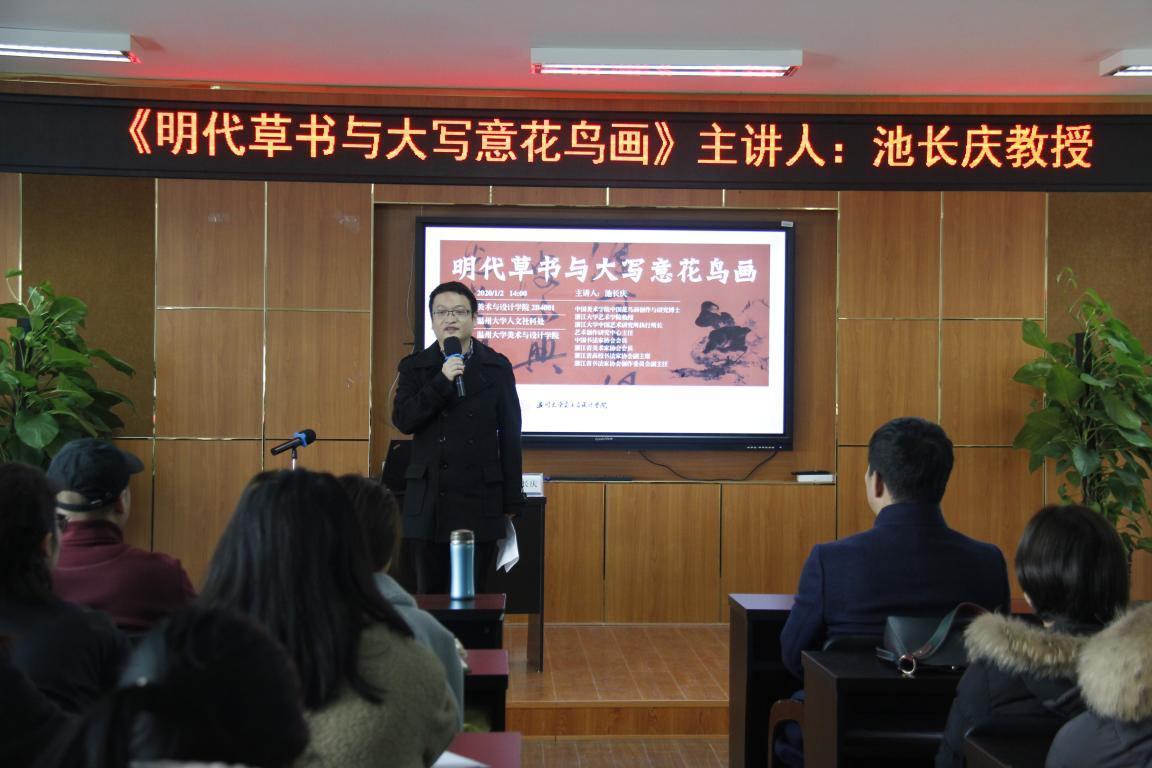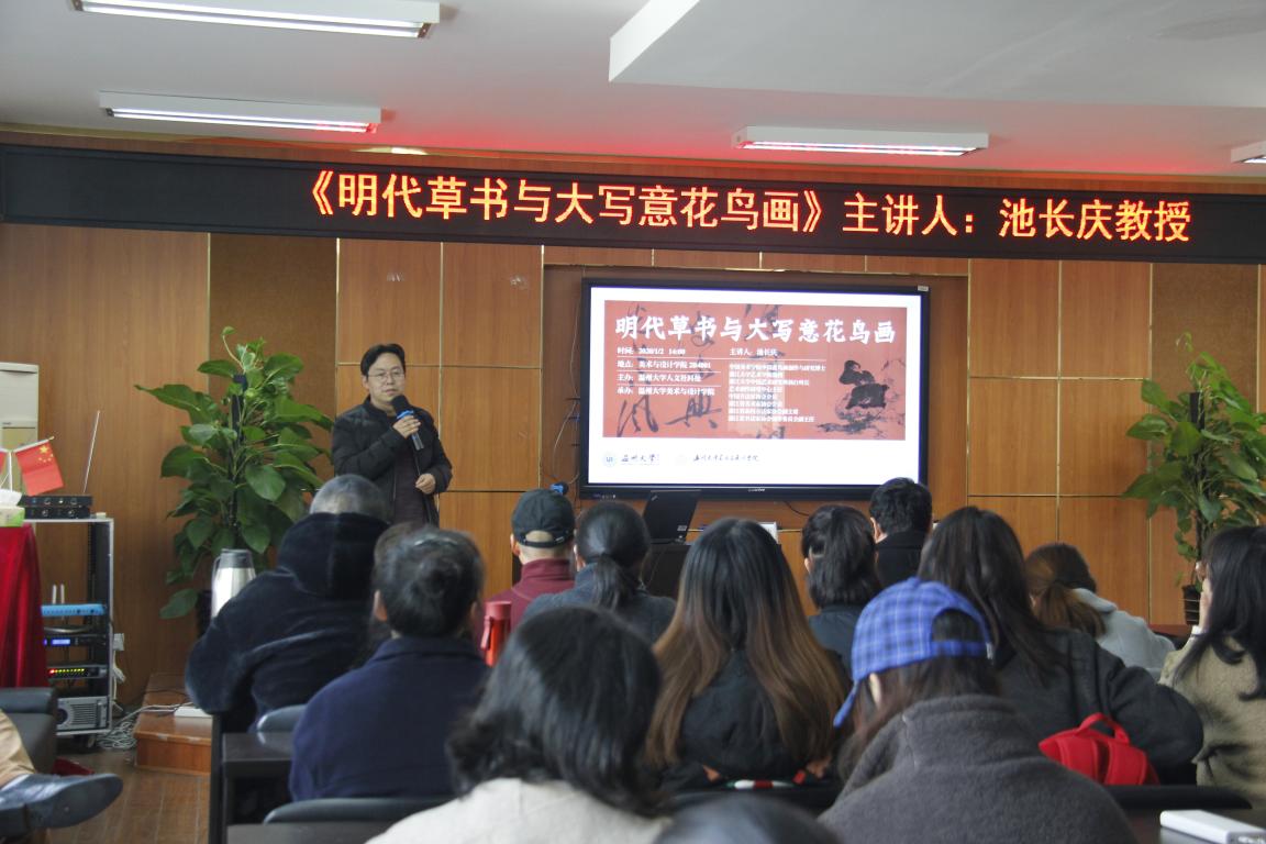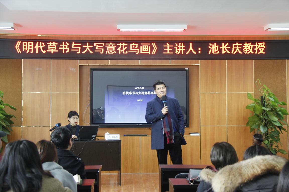 1月2日下午,万象城荣幸邀请到浙江大学中国艺术研究所执行所长、艺术创作研究中心主任池长庆教授,为万象城师生带来一场题为《明代草书与大写意花鸟画》的讲座。学院院长谢子静、副院长顾任飞、美术系专业老师,研究生、本科生及温州书法爱好者共80多人参加活动,丁海涵副教授担任学术主持。