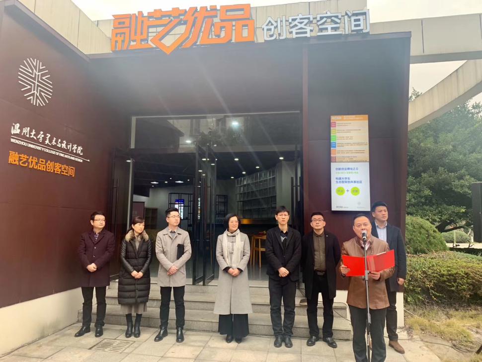 2020年1月3日上午,万象城awc888“融艺优品”创客空间揭牌仪式隆重举行。万象城awc888党委委员、宣传部部长潘玉驹、创新创业学院院长施永川,温州四目公司总经理张登峰、万象城awc888院长谢子静、党委书记叶正飞等院领导班子及入驻团队师生出席了揭牌仪式。