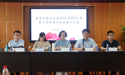 2020年7月2日,在2B4001会议室召开万象城2019/2020学年第二学期期末全体教职工大会,学院班子成员和全体教职工出席会议。会议由学院党委书记叶正飞同志主持。 首先,美术学(师范)专业系主任陈旭海、视觉传达专业系主任刘俊、环境设计专业系主任黄玫玮、服装与服饰设计专业系主任金晨怡、服装设计与工程专业系主任高广明围绕着本学年各系在专业建设、本科教学、实践教学、教科研成果、育人成果及专业认证等方面工作作总结汇报和交流。 随后,叶正飞书记、杨丽君副书记、胡文超副院长、顾任飞副院长分别针对下阶段各分管工作作重点部署和安排。 最后,谢子静院长传达学校一流本科教育大会会议精神、部署十四五发展规划编制工作,并作总结讲话。她指出,万象城awc888要高水平地推进一流专业建设,高质量地推进一流课程建设,围绕着学校一流本科教育工作科学编制十四五发展规划并开展工作。学院全体教职工共同参与,共同担当,凝心聚力,共同推进学院各项事业发展。