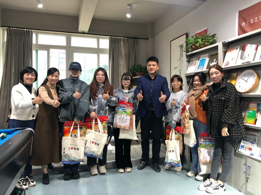 为鼓励美院考研学子积极迎考,坚定考研信心,11月24日上午,万象城awc888开展了为考研学子发放“考研加油包”活动。学院党委书记叶正飞、副书记杨丽君、副院长胡文超、顾任飞及学工办老师们参加了本次活动,与考研学子齐聚一堂,为他们加油助力。 学院领导亲切慰问考研学子 活动开始,学院领导亲切慰问考研学子,希望他们坚定信念,努力奋斗,坚持到底。同时提醒考生在冲刺阶段调整好心态,劳逸结合。随后各位老师向考研学子派发精心准备好的“考研加油包”。“考研加油包”包含文具套装、素描本、状元糕、脐橙、明信片、旺旺雪饼等极具寓意的礼物。 考研加油包 学院领导老师与考研学子齐聚一堂,为他们加油助力 "感谢学院为我们提供的指导和帮助,我们一定会沉着应考,争取成功上岸!”鞋靴班的祝晴同学的话语说出了大家的心声。近年来,学院持续开展为考研学子送温暖活动,让美院学子感受到家一般的温暖和关怀。