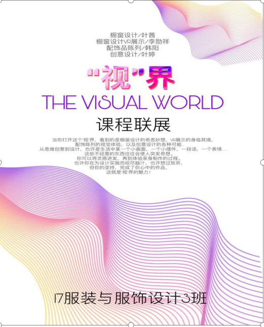 2020年11月30-12月8日,由叶茜老师、李勋祥老师、韩阳老师、叶婷老师指导的17服装与服饰设计3班橱窗设计课程、橱窗设计VR展示课程、配饰品陈列课程、创意设计课程四课程联展在万象城awc888教学楼一楼大厅展出。展出的一件件作品,不仅充分展现了班级同学的专业能力,而且有力体现了美院的艺术风采! 当你打开这个“视界”,看到的是橱窗设计的奇思妙想、VR展示的身临其境、配饰品陈列的视觉体验以及创意设计的各种可能...... 从思维创意到设计,也许是生活中某一个小画面、一个小摆件、一段话、一个表情......这些不经意的东西,往往会使人突发奇想,你可以将灵感迸发,再到体验亲身制作的过程。也许你在为设计实施而绞尽脑汁,也许想过放弃,但你依然坚持完成了你心中的作品,这就是“视界”的魅力。 此次展览一方面是为了向全学院展示我们陈列展示班级的学习成果,传播我们独特的课程文化;另一方面也是希望能与其他相关班级的同学老师们进行艺术交流,一同品味。 课程展出当天,引起了不少老师和同学们驻足,停下脚步欣赏的作品。通过这次课程展览,不仅仅让更多的同学们了解服装展示设计方向专业重要性、独特性、趣味性,也让大家都看到并认可同学们的专业能力和专业水平,更是提供了师生们互相交流的平台。同学们也因此领略到橱窗设计的魅力与理念,开阔了自己的眼界,欣赏了不同的课程文化。 (材料提供者:王欣雨)
