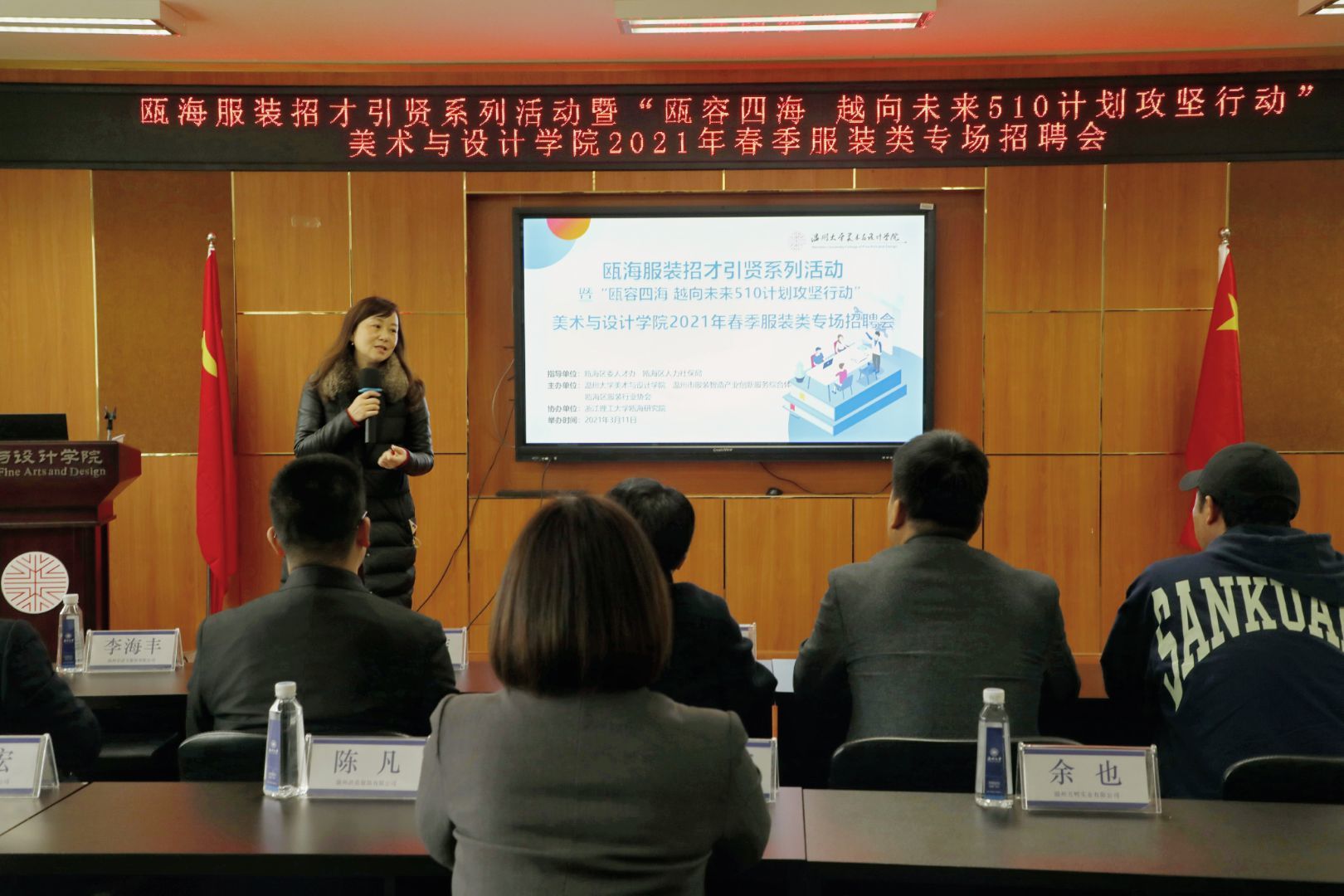 3月11日上午,在万象城awc888召开了瓯海服装招才引贤系列活动暨“瓯容四海越向未来510计划攻坚行动”万象城awc8882021年春季服装类专场招聘会。 此次招聘会由万象城awc888、温州市服装智造产业创新服务综合体、 瓯海区服装行业协会主办、由瓯海区委人才办 瓯海区人力社保局负责指导。 参加此次会议的嘉宾有万象城awc888党委书记叶正飞、温州市服装智造产业创新服务综合体负责人任力、瓯海服装行业协会秘书长苏立玲、万象城awc888党委副书记杨丽君、学院副院长顾任飞、以及11家在瓯海区优秀的服装企业负责人,近70位毕业生参加。 会议开始前,杨丽君副书记简要介绍了近几年万象城awc888的发展、人才培养以及毕业生就业的相关情况。随后,瓯海服装行业协会秘书长苏立玲对瓯海服饰产业的基本情况进行解读,浙江理工大学瓯海研究院副院长,温州市服装智造产业创新服务综合体负责人任力介绍了综合体的设计思想,从重点项目、功能分布、设计亮点三部分对每个楼层进行分析。在了解瓯海对于高校大学生留温政策之后,11家企业负责人通过介绍企业、岗位需求、待遇三方面来讲述,为此次参加招聘会的同学提供就业岗位的机会。 招聘会在热烈的掌声中圆满结束。就业是每个大学生都要跨过的一道门槛,是人生的重要转折点。万丈高楼平地起,将就业看作是展示自己的平台,充分发挥自己的才干,让梦腾飞。