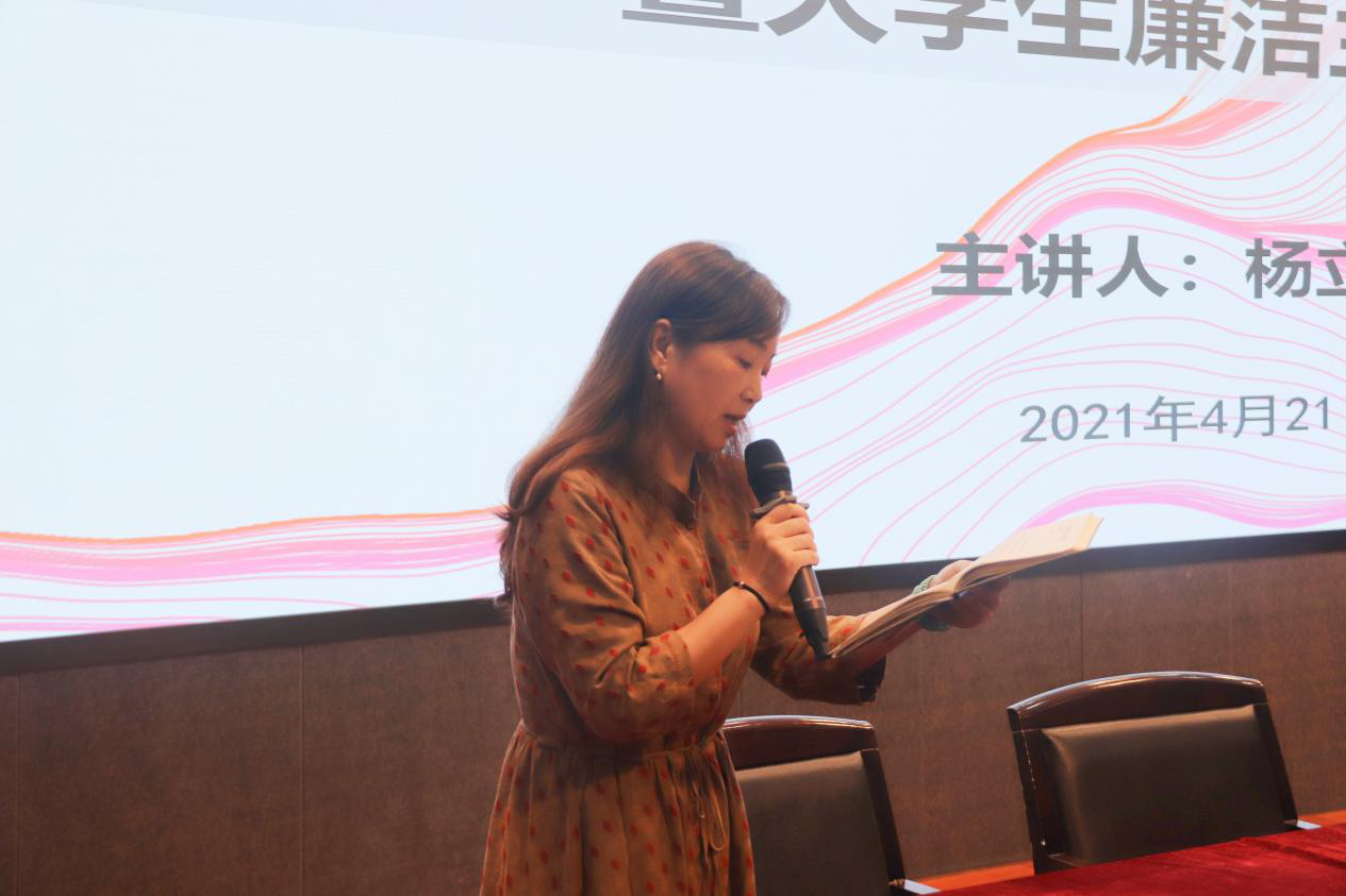 最后,杨立淮老师提出建设清廉温大,需要我们加强理论与政策法规学习,树立是非善恶的大局观念,做到“慎独、慎微、慎初”。与此同时,杨立淮老师号召学生一起创建清廉学风,推动清廉校园发展。强化纪律刚性约束,时刻绷紧纪律之弦,我们要清楚认识到在学校内所获得的荣誉只代表某一阶段的成绩,并不是职场的敲门砖。因此,我们要加强思想淬炼、政治历炼、实践锻炼和专业训练,营造清廉的中心氛围,从而获得自我以及团体的提升。