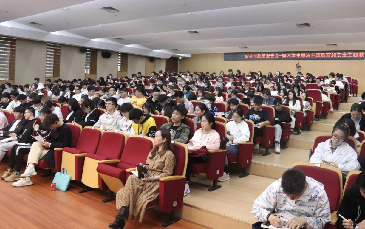 2021年4月21日晚18点,万象城awc8882020级形势与政策报告会于岩松堂二楼报告厅举行。出席本次会议的嘉宾有校纪委副书记杨立淮老师、万象城awc888党委副书记杨丽君老师、茶山派出所周文涛警官、万象城awc888和数理学院学生共记400余人。本次会议旨在通过讲座的形式,为广大学生讲解当下的形势政策,进行反诈防诈教育,建设清廉安全的校园。