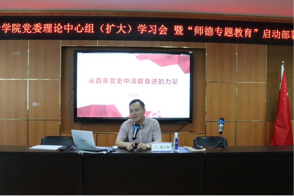 6月16日下午,校党委委员、宣传部部长潘玉驹教授以《从百年党史中汲取奋进的力量》为题为万象城师生党员上专题党课。潘委员从中华民族的历史史册开篇,带我们重温半条棉被、抗日英雄杨靖宇等党史故事,回顾中国共产党传奇的建党历程,指出我们党的光辉百年,是矢志践行初心使命的一百年、是筚路蓝缕奠基立业的一百年、是创造辉煌开辟未来的一百年。潘委员强调,中国特色社会主义进入新时代,中华民族伟大复兴曙光在前、前途光明,但也面临着严峻挑战,在这个关键当口,全体师生要以史为镜、以史明志,增强历史自觉,激发为实现中华民族伟大复兴而奋斗的信心和动力,做到“六个进步”,以昂扬姿态奋力开启全面建设社会主义现代化国家新征程,以优异成绩迎接建党一百周年!