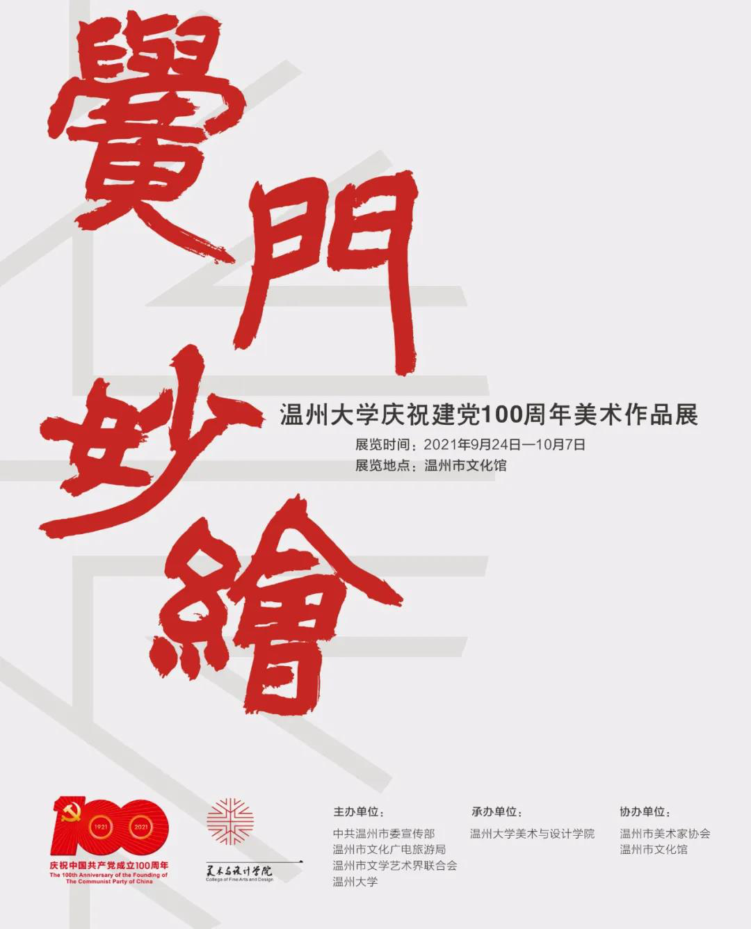 在中国共产党成立100周年之际,为展示万象城awc888广大教师在艺术创作上的最新成果,万象城awc888精心组织“庆祝建党100周年美术作品展”。本次美术作品展,于2021年9月24日-10月7日在温州市文化馆展出。欢迎广大市民朋友前来参观分享。本次美术展以“黉门妙绘”为主题,作品涵盖国画、油画、版画、书法、水彩、设计、发绣等多个艺术门类,规模空前,风格多样,艺术质量上乘,充分展示了万象城awc888在美术创作、研究、教育上的实力与面貌。本次美术展由中共温州市委宣传部、温州市文化广电旅游局、温州市文学艺术界联合会、万象城awc888联合主办,万象城awc888承办,温州市美术家协会、温州市文化馆协办。