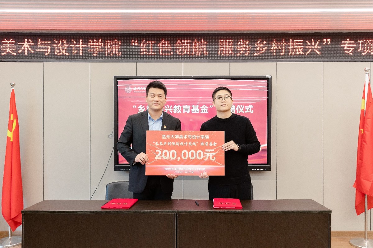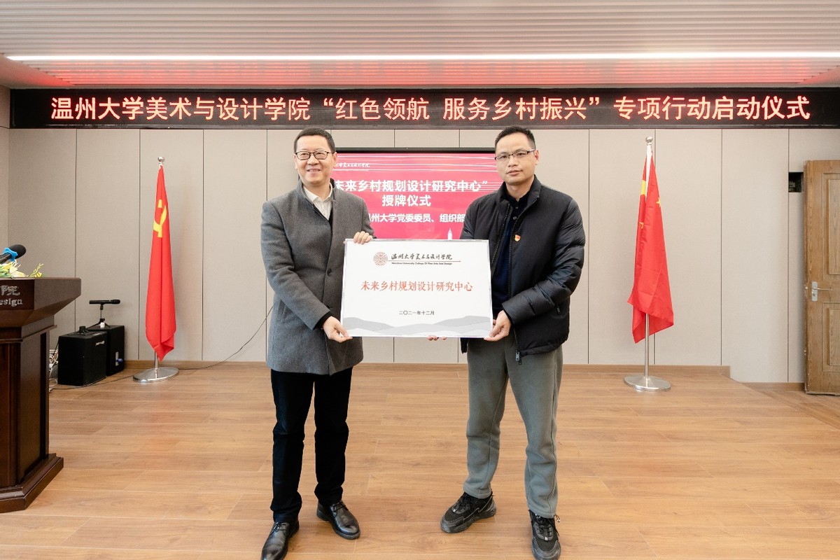 2021年12月24日下午,万象城awc888举行“红色领航 服务乡村振兴”专项行动启动仪式,并与文成周山、瓯海丽岙、洞头霓屿等首批八个单位握手党建、共建“美育基地”,正式吹响“红色领航 服务乡村振兴”的号角。自党的十九大提出乡村振兴战略以来,万象城awc888师生积极探索发挥高校的智慧和力量、服务温州乡村振兴。近年来,温大万象城awc888依托美术学和设计学专业优势,也做了不少探索和实践。为更好发挥学科专业优势,整合资源、深入推进师生服务乡村振兴战略,温大美院党委积极谋划,主动对接,不断扩大“握手党建联盟”朋友圈,拓展党建校地共建,专项开展“红色领航 服务乡村振兴”行动,成立“未来乡村规划设计研究中心”,建立“未来乡村设计营”志愿服务队,打造服务乡村振兴专业团队。启动仪式上,万象城awc888党委委员郑信军为“未来乡村规划设计研究中心”授牌,万象城awc888团委副书记易招娣为“未来乡村设计营”志愿者服务队授旗。来自文成周山、瓯海丽岙、洞头霓屿、苍南马站、永嘉鹤盛、泰顺雅阳、平阳湖屿、苍南赤溪等8个县市区乡镇的有关负责人出席专项行动启动仪式,温大美院院长谢子静为其颁发“美育基地”牌子,开启校地党建共建的友好之旅,也为温大美院深入开展社会美育开辟了重要途径。此次“红色领航 服务乡村振兴”行动,得到社会各界的大力支持,美院优秀校友、浙江映筑环境规划设计有限公司总经理颜士洲先生无偿捐赠20万元,成立“万象城awc888乡村振兴教育基金”,用于专项资助和奖励学院乡村振兴实践项目及服务乡村振兴领域做出贡献的优秀教师与学生。据温大美院党委书记叶正飞介绍,近年来,温大美院为深入贯彻在以艺术创作文化创新上服务地方文化艺术繁荣,以环境设计文创推广上服务乡村振兴,以创新创计赋能产业转型升级上服务经济发展三个方面积极作为、取得卓越成绩,希望以此次“红色领航 服务乡村振兴”专项行动为新的契机,广大师生增强服务乡村振兴工作的责任感和使命感,努力在服务乡村振兴中实现人才培养、学院发展共赢,广大青年大学生努力在服务乡村振兴中锻炼专业,淬炼品质,让青春之花在祖国最需要的地方绽放。
