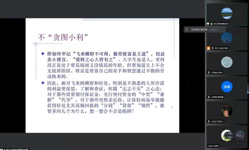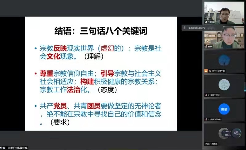 2021年12月22日晚18点,万象城awc8882021级形势与政策报告会在疫情防控的要求下于线上举行。本次会议的由万象城awc888学工办主任杨鹏老师主持,并特邀了马克思主义学院党委书记王柏民老师、万象城awc888纪委副书记杨立淮老师以及万象城awc888学生共计两百余人。本次会议旨在通过线上讲座的形式,为广大学生解读马克思主义宗教观以及构建网络安全生态环境下对大数据时代的思考,进行反诈防诈教育,建设和谐安全的校园。