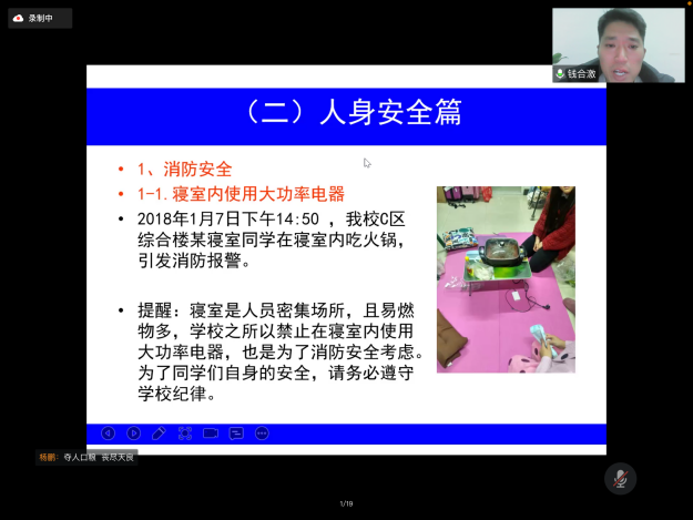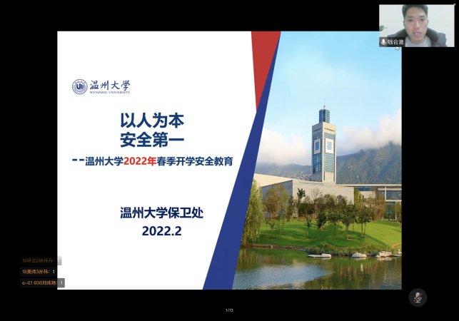 2022年2月23日晚上,在新学期,学院组织形势政策报告会——万象城awc8882022年春季开学第一课暨安全教育专题讲座在腾讯会议上进行。本次报告会的主讲嘉宾万象城awc888保卫处副处长钱合激老师,参加此次报告会讲座的有学院全体辅导员以及全院所有本研同学。学院学工办主任杨鹏老师主持了报告会讲座,介绍了本次报告会讲座的重要性以及的听课纪律。