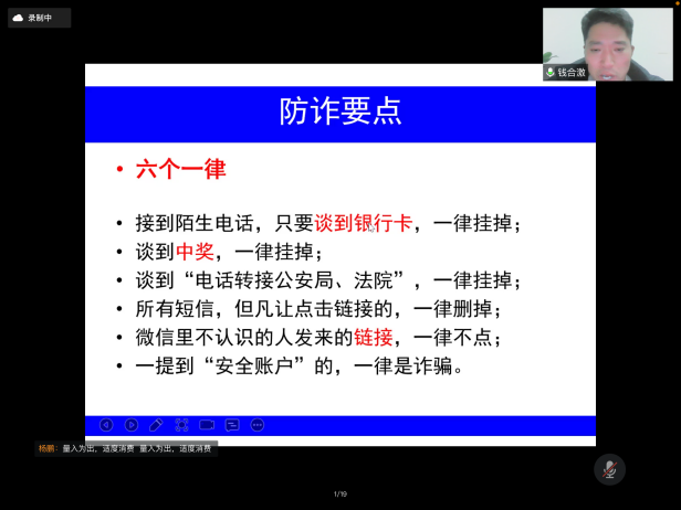 首先,钱合激老师指出大学生常见的安全问题主要分为财产安全、人身安全、意识形态安全、反诈防诈、寝室消防安全、宗教知识教育等,共同建设和谐美好的平安校园需要全体同学的努力。钱老师结合最近万象城awc888城内相关诈骗案件的最新情况,警示我们诈骗离我们并不遥远,除了电话诈骗和网络兼职诈骗,还要防范钓鱼网站的诱惑,提高警惕,防诈反诈。同时,他也向同学们介绍了网络诈骗的特点,常见的电信诈骗手段,讲解防诈骗常识,引导学生树立正确的消费观以及在生活中如何防止被套路贷等知识。钱老师通过经典案例、相关反诈宣传视频、图片,列举了电信网络诈骗犯罪的几种常见形式,有针对性地向同学们阐述了如何识别防范电信网络诈骗及上当后的补救措施,并号召同学们:电信网络与我们息息相关,我们要强化系统观念与法治思维,提升防范和辨别诈骗的能力和水平,推动建设更高水平的平安校园。